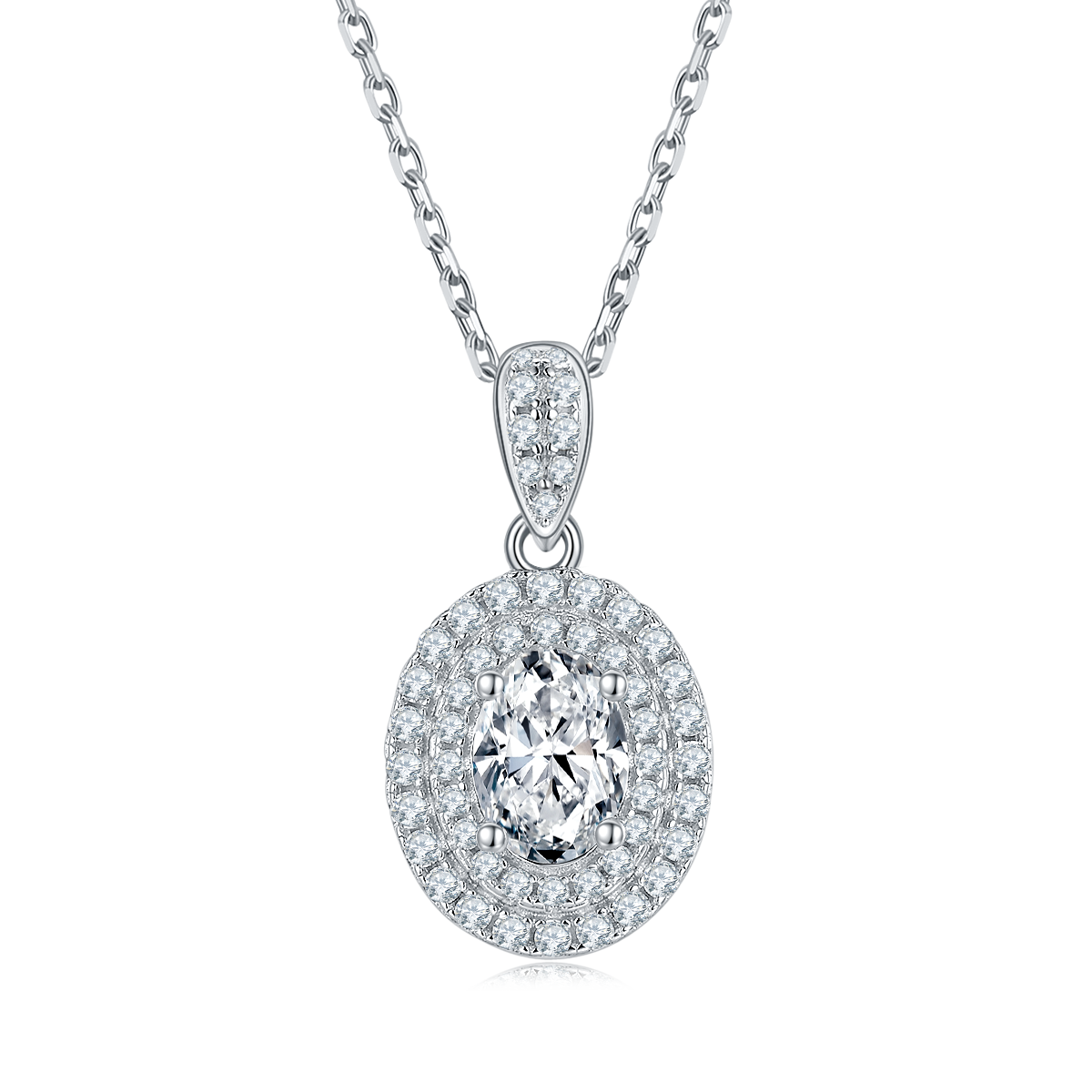 This luxurious necklace features a 1.0-carat oval-cut Moissanite stone as its centerpiece, which is known for its brilliant sparkle and exceptional durability.
