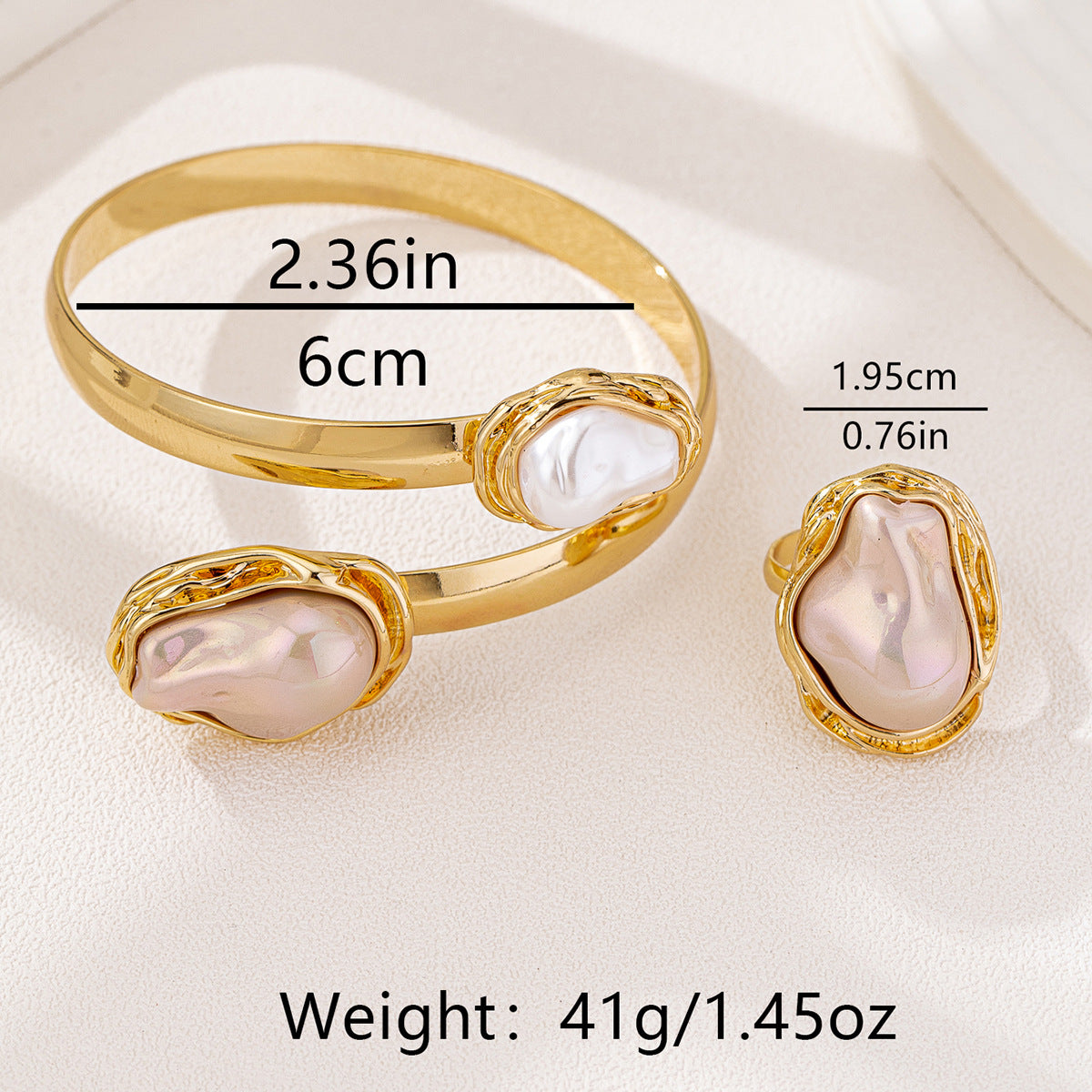 This stunning set includes an irregular imitation pearl ring and a cross design imitation pearl bracelet, both of which are made from high-quality metal to ensure durability and shine. The adjustable ring features a unique irregular design, making it a standout piece for any event. The bracelet, adorned with beautifully crafted imitation pearls, enhances your wrist with a touch of sophistication.