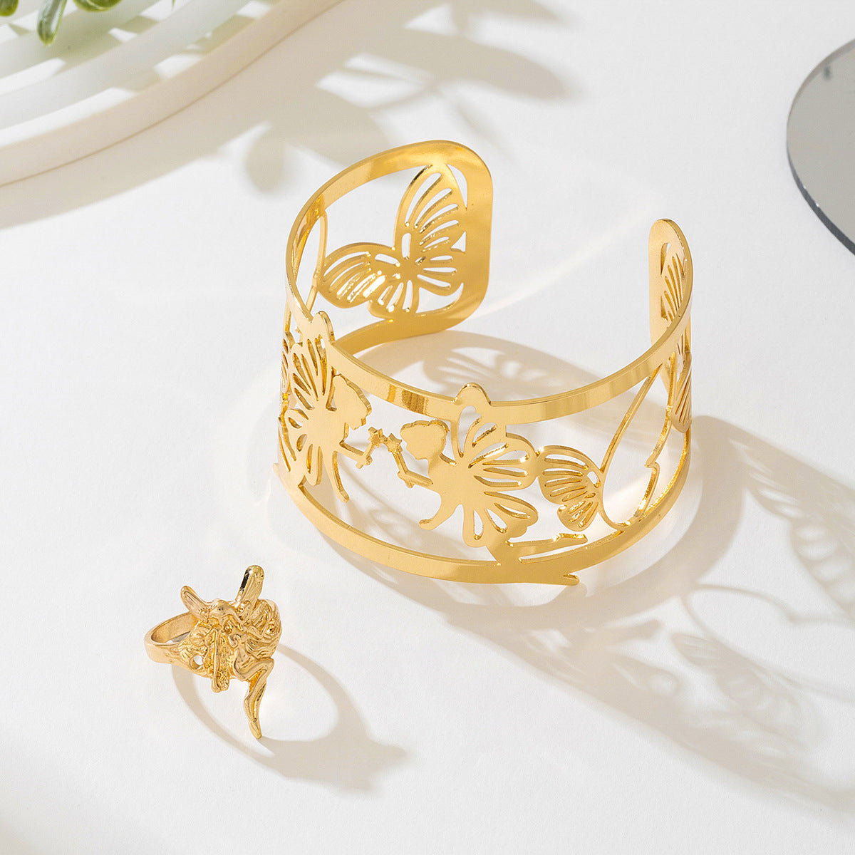 1 Set of European and American Cross-Border Personalized Retro Metal Gold Butterfly Elf Hollow Women's Bracelet Ring Jewelry Set by Planderful delivers an exquisite blend of elegance and individuality for those seeking unique fashion accessories.