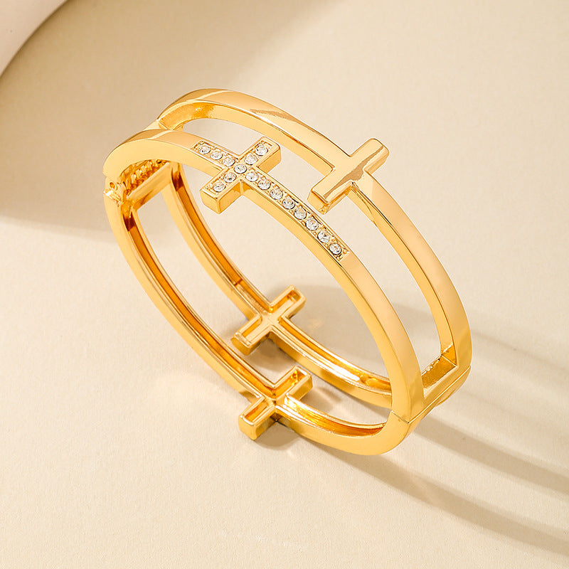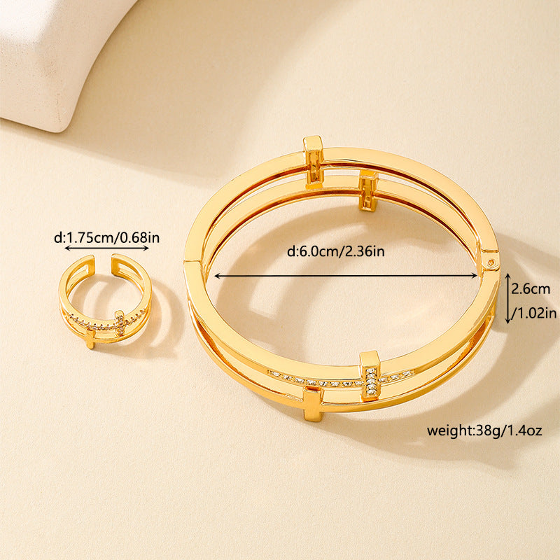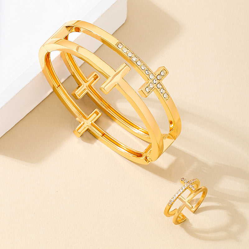 1 Set of European and American Style Metal Retro Design Zircon-Encrusted Cross Double-Layer Spring Buckle Women's Bracelet Ring Jewelry Set by Planderful delivers a stunning fashion statement for every occasion.