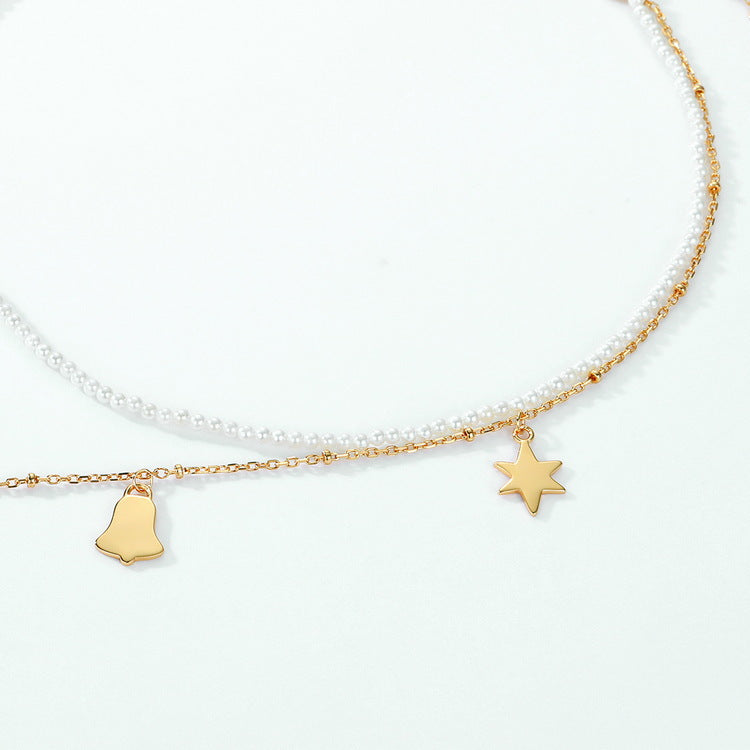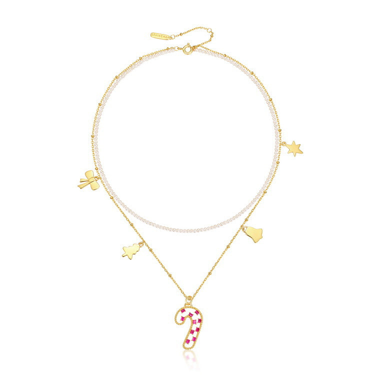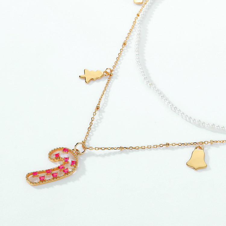 This exquisite double-layer necklace features one sterling silver chain and one pearl chain for elegance and luxury. Featuring a Christmas Crutch Pendant adorned with small Red Corundum for sparkly. Crafted with sterling silver plated in gold, perfect for adding a touch of elegance to any look. The necklace is designed to make a statement, with the golden and pearl chains giving a luxurious finish, and the small red corundum adding a touch of sparkle. The perfect addition for any outfit, this exquisite piece will last for years to come.