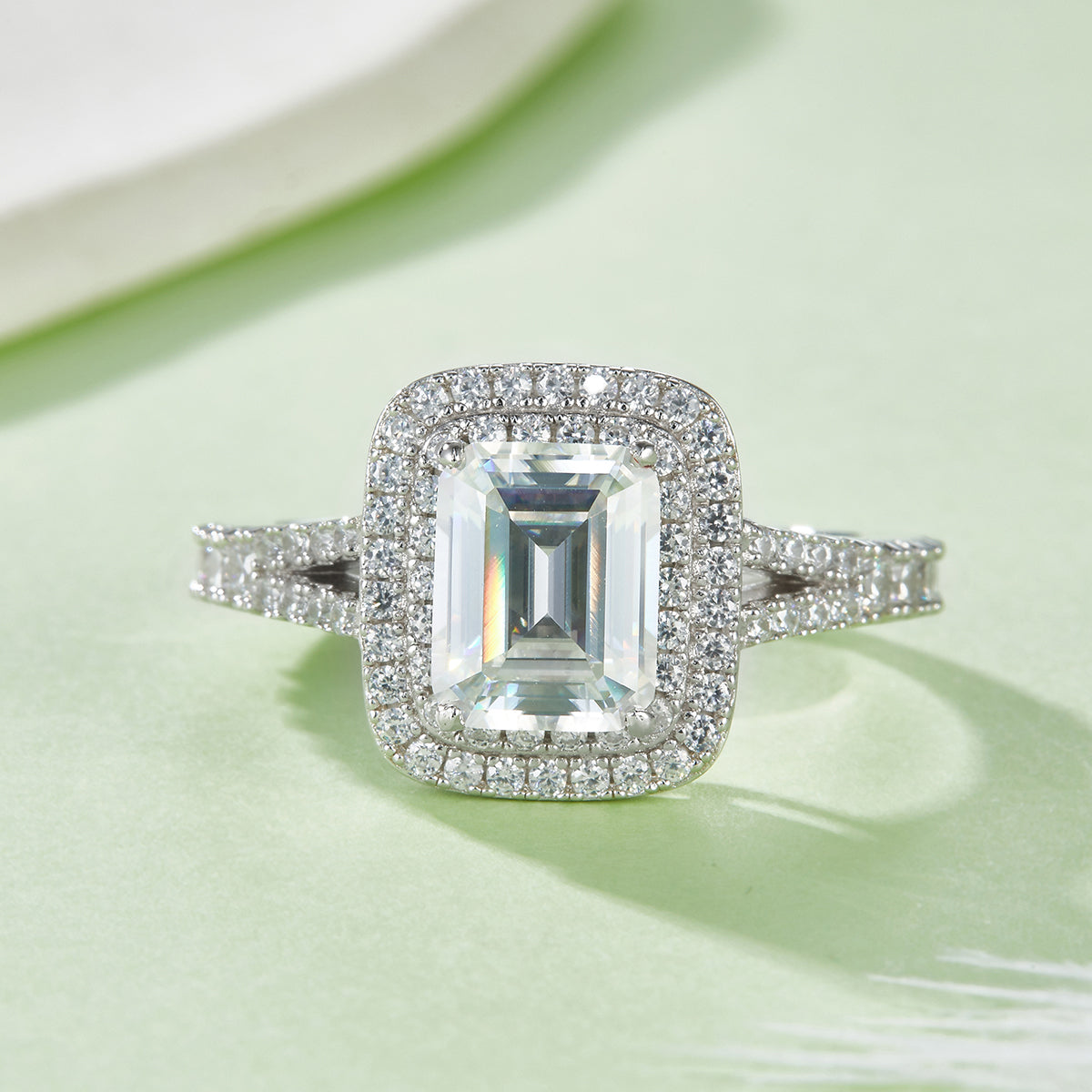 • Stunning Design: The emerald cut moissanite center stone surrounded by a double halo creates a breathtaking visual effect that captures light brilliantly.