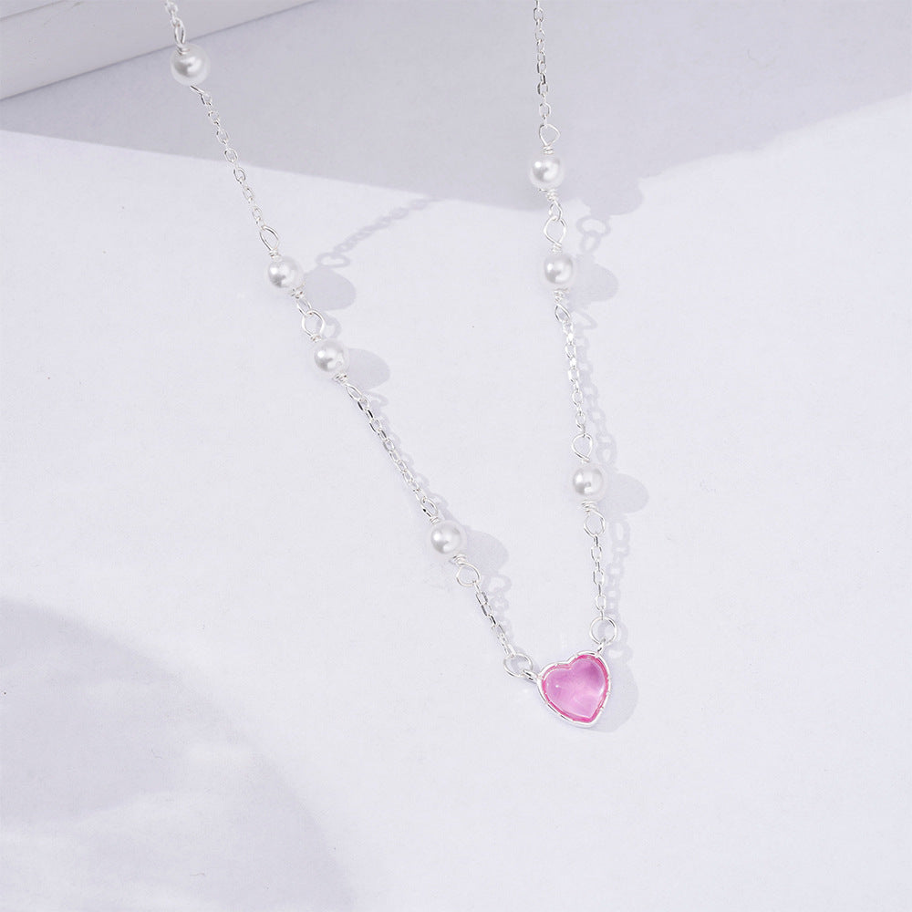 This beautiful pink heart pendant pearl silver necklace adds a touch of elegance to any outfit. Crafted from quality sterling silver and featuring a pink heart pendant, decorated with pearls on the chain, this necklace is sure to make a statement. Enjoy the sparkle and sophistication of this stunning piece.