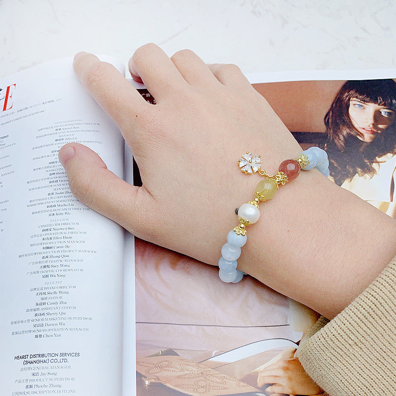 Indulge in the allure of our Korean Edition Crystal Bracelet, adorned with small and luxurious zircon pendants, aquamarine, and gold hair crystals. This stunning piece from the Planderful Collection, named Fortune's Favor, is crafted with sterling silver and features an array of mesmerizing crystals including aquamarine and zircon. It's the perfect accessory to elevate your ensemble and add a touch of elegance to any look.