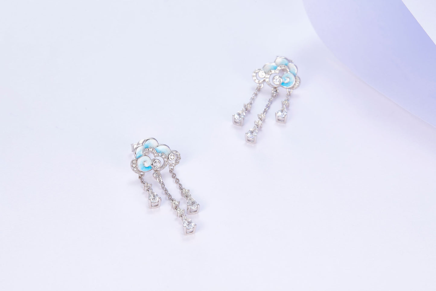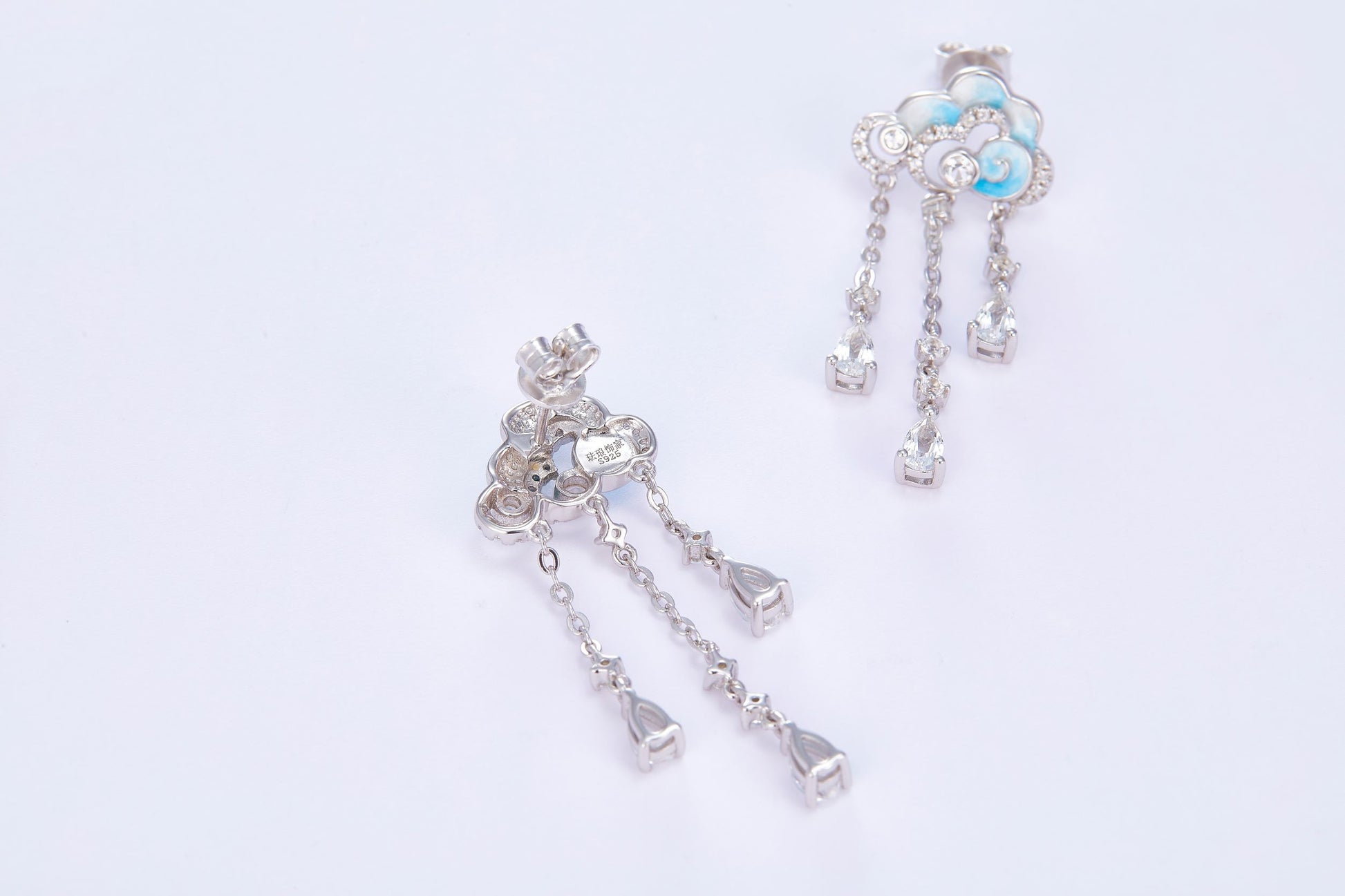 This drop earring is a creative and charming accessory inspired by the sky. It is crafted with enamel technology to create a sky blue cloud, inlaid with crushed zircon, resembling sparkling stars. Under the clouds hung three tassels, each with a white zircon, symbolizing freedom, dreams, and purity. Earrings are made of pure silver, with excellent texture and durability without discoloration.