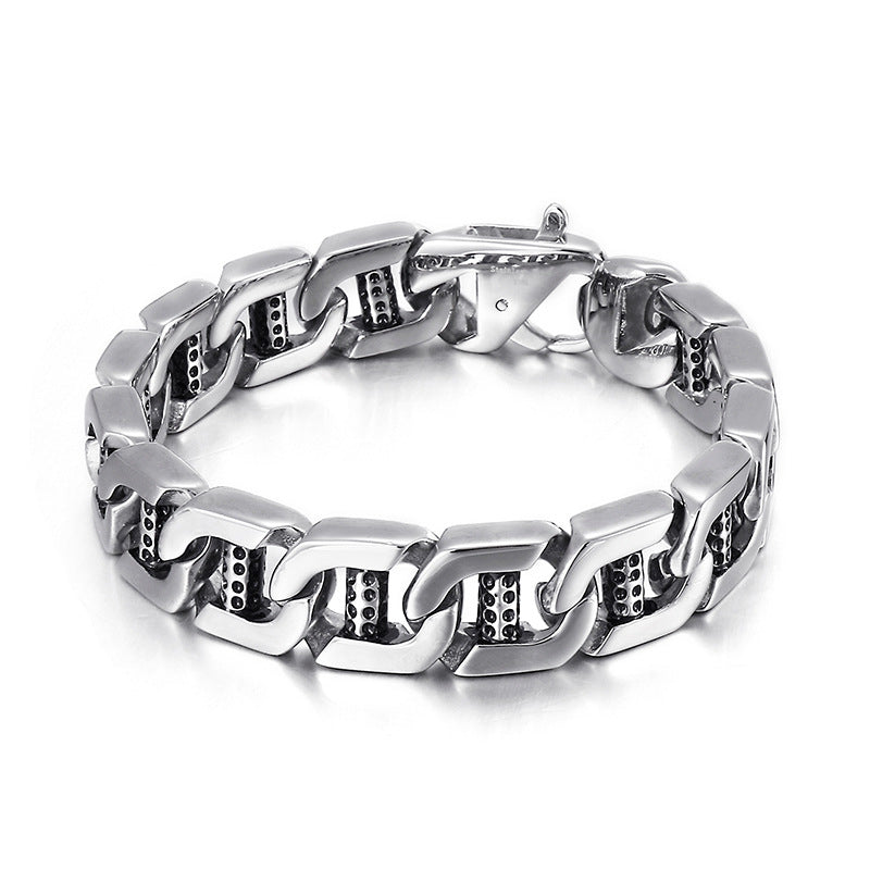 Unleash your inner rebel with our European and American punk style hollow dice dot hole pillar titanium steel men's bracelet. This striking piece is designed for the modern man who appreciates bold accessories that make a statement.