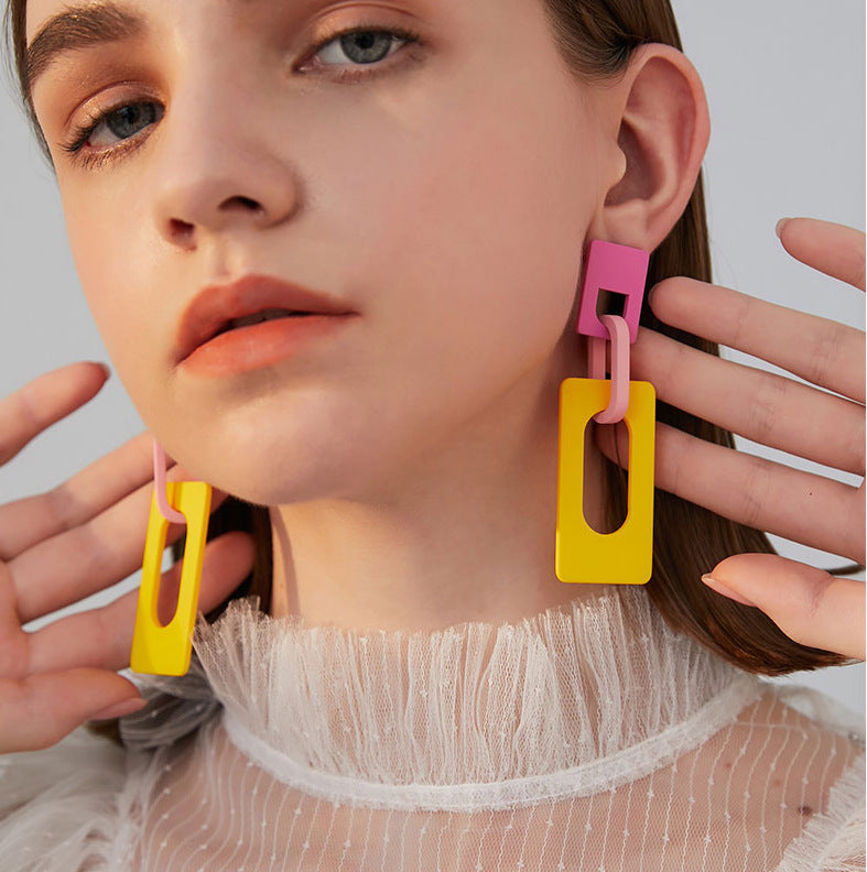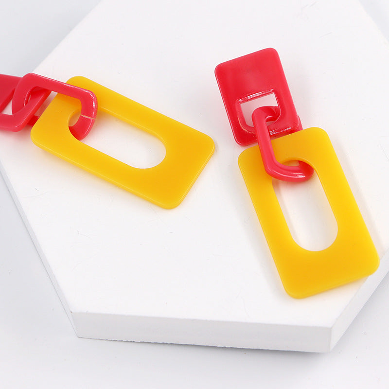Introducing our European and American Style Popular New Exaggerated Fashion Color Acrylic Geometric Stud Earrings! These stunning earrings are perfect for those who want to make a bold statement with their accessories.