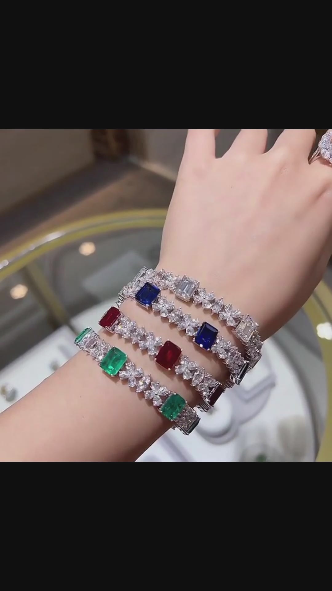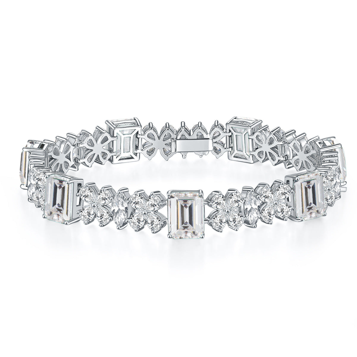 This gorgeous bracelet features symmetry and sparkle, perfect for any occasion. It holds four colors of Emerald Shape zircon and Ice Cut Petals zircon, provides a beautiful shimmer that catches any eye. Enhance your outfit with this elegant and timeless accessory.
