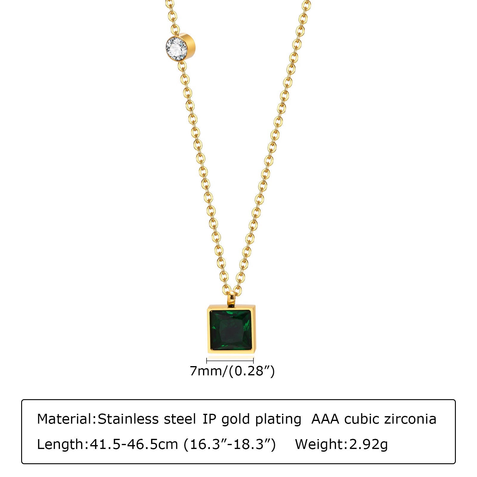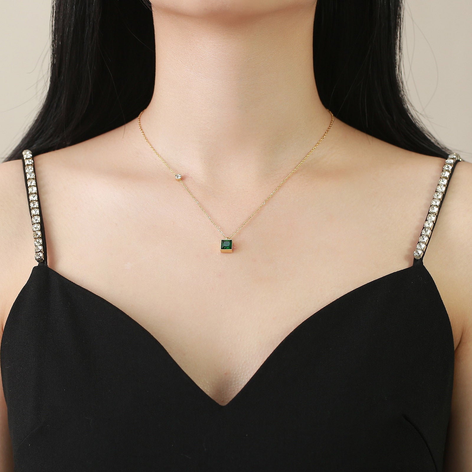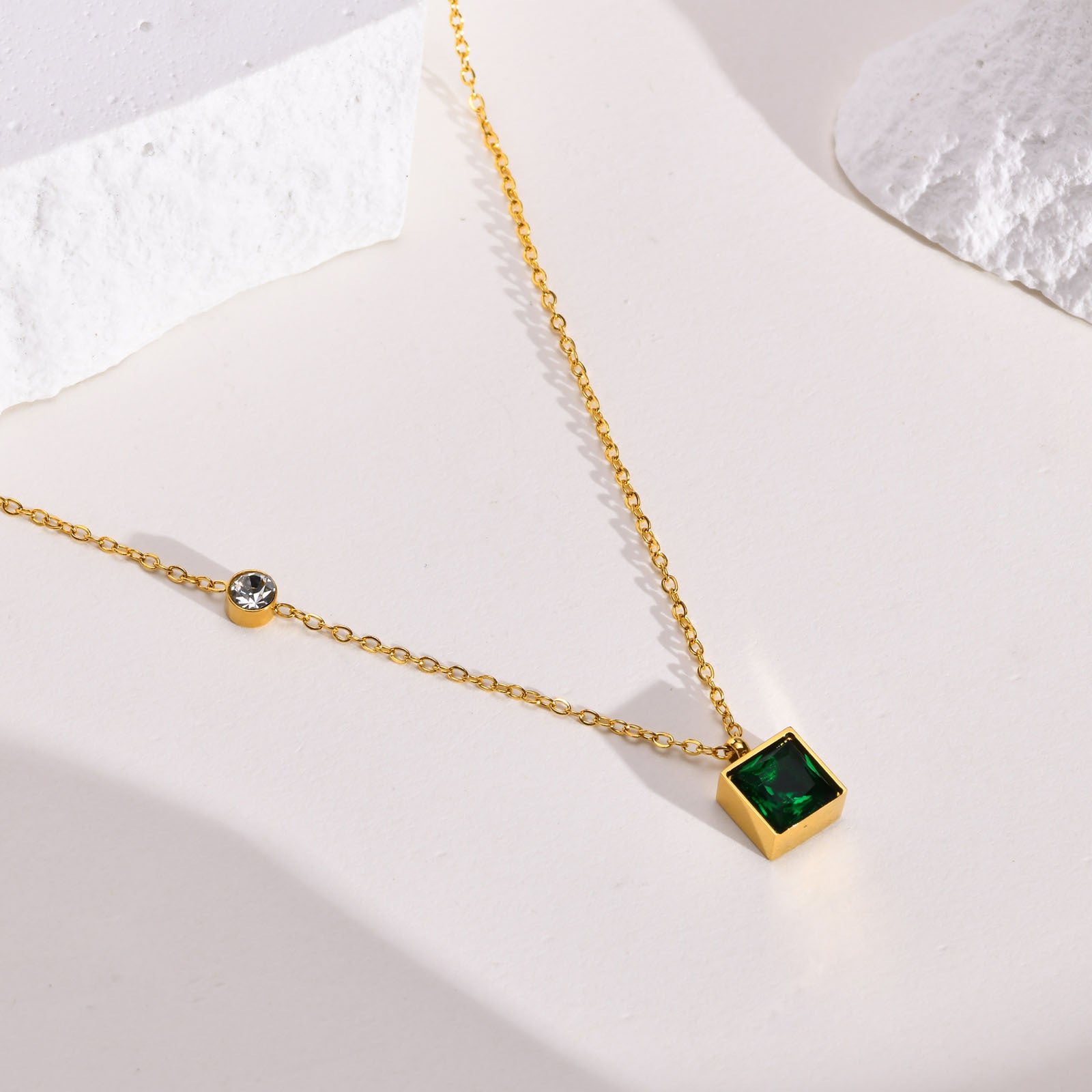 The geometric design features a captivating square pendant adorned with vibrant green zircon, adding a pop of color that effortlessly enhances any outfit. Whether you're dressing up for a special occasion or adding flair to your everyday look, this necklace is versatile enough to be worn on any occasion.
