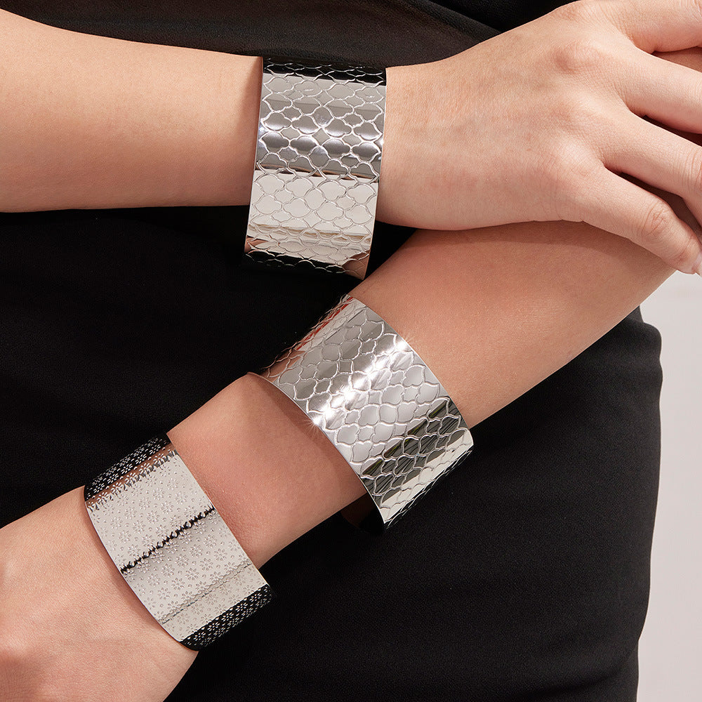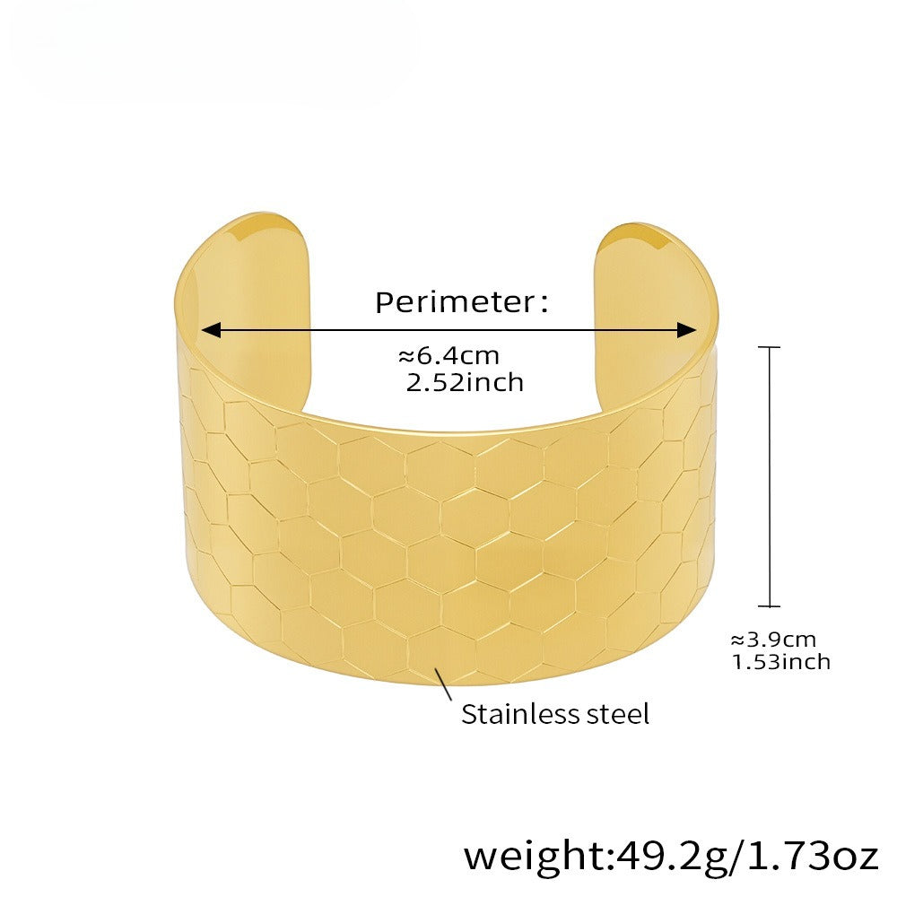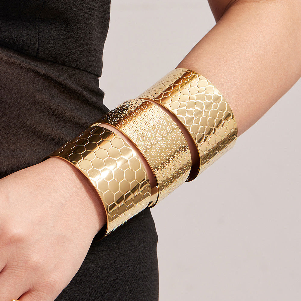 The bracelet features a 35mm wide band and an opening, adjustable design that makes it effortless to wear while delivering a secure, comfortable fit. Its exaggerated silhouette adds dramatic flair to any outfit, from casual daytime looks to sophisticated evening ensembles.