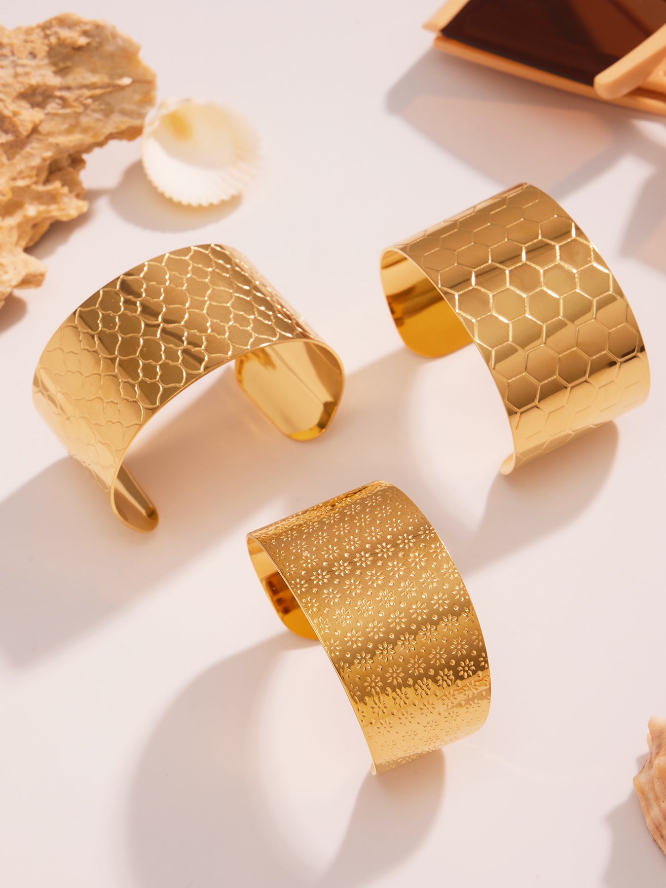 Elevate your everyday look with the Planderful Heavy Industry 35mm Wide Opening Bracelet. Plated in 18k gold and designed with a bold flower pattern, this statement piece blends industrial strength with delicate detailing for a truly unique accessory.