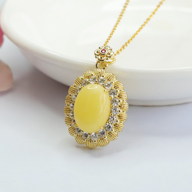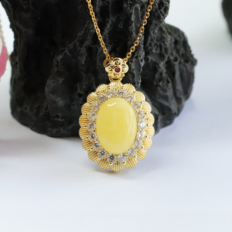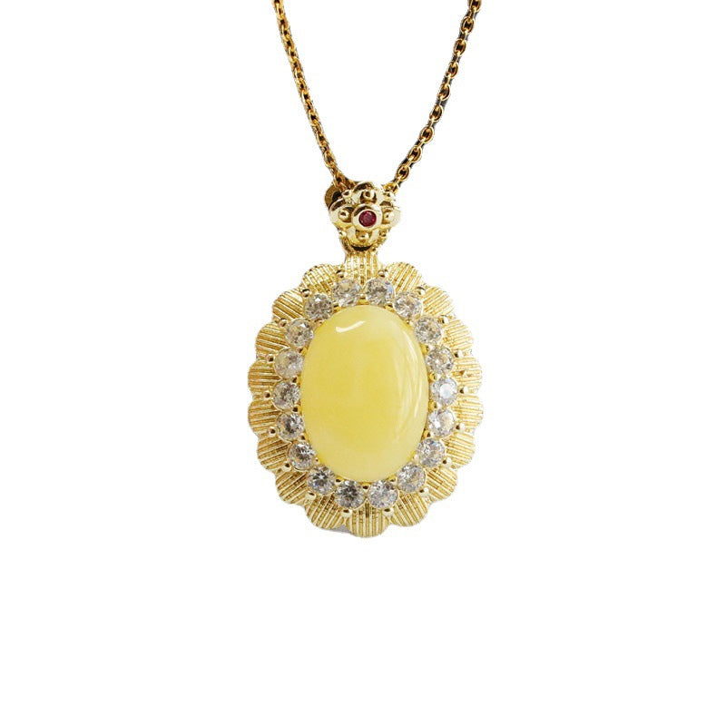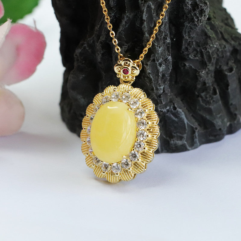 Yellow Amber Beeswax Pendant with Zircon Flower Halo Necklace Jewelry