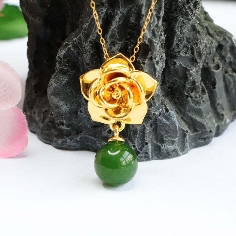 Hetian Jade and Jasper Rose Necklace with Sterling Silver Pendant