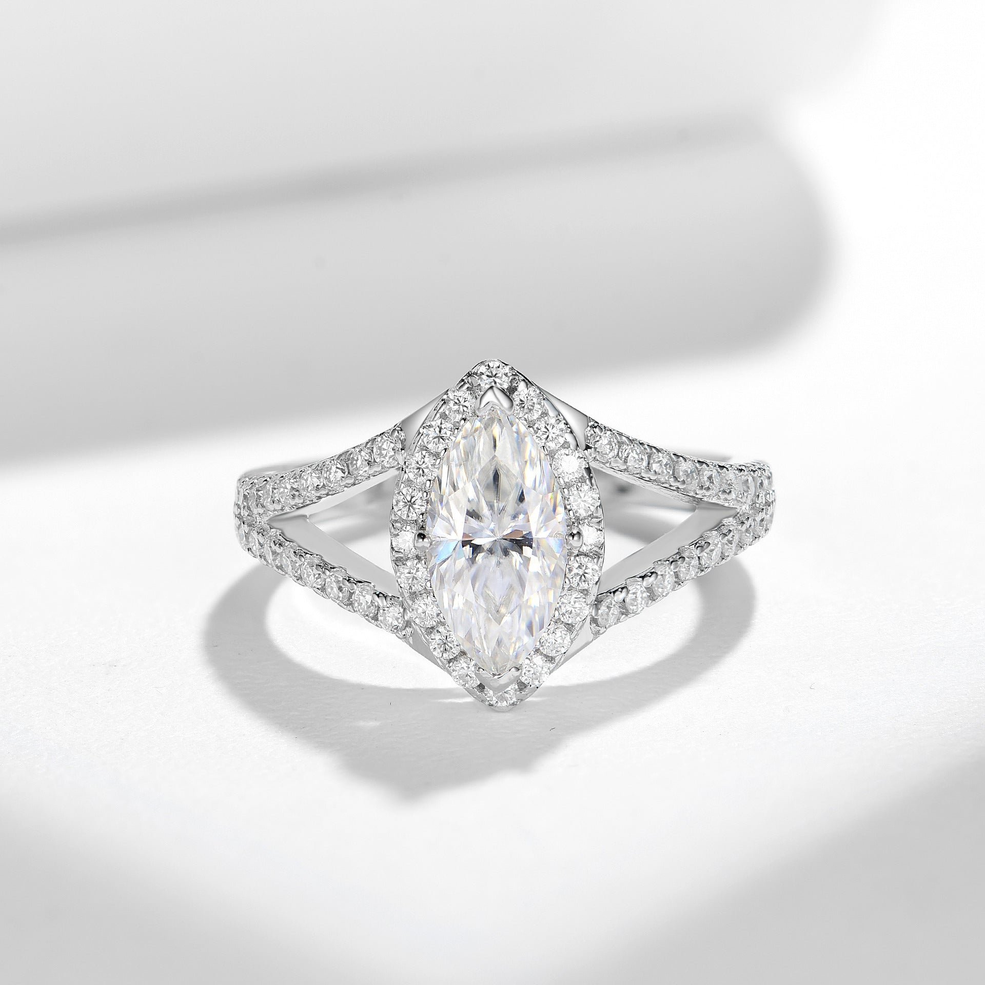• Main stone: 5 × 10 mm marquise-cut Moissanite, D color, VVS clarity, 3EX cut, 1.48 ct
