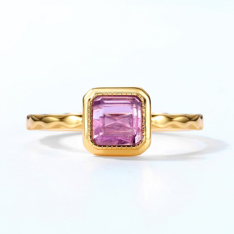 Indulge in the luxurious beauty of this Geometric Square Natural Amethyst Wavy Sterling Silver Ring. Crafted with exquisite Sterling Silver plated in gold, this ring is adorned with a stunning Square Natural Amethyst, perfectly complemented by a unique Wavy ring arm. Elevate any outfit with this exclusive and tasteful piece.