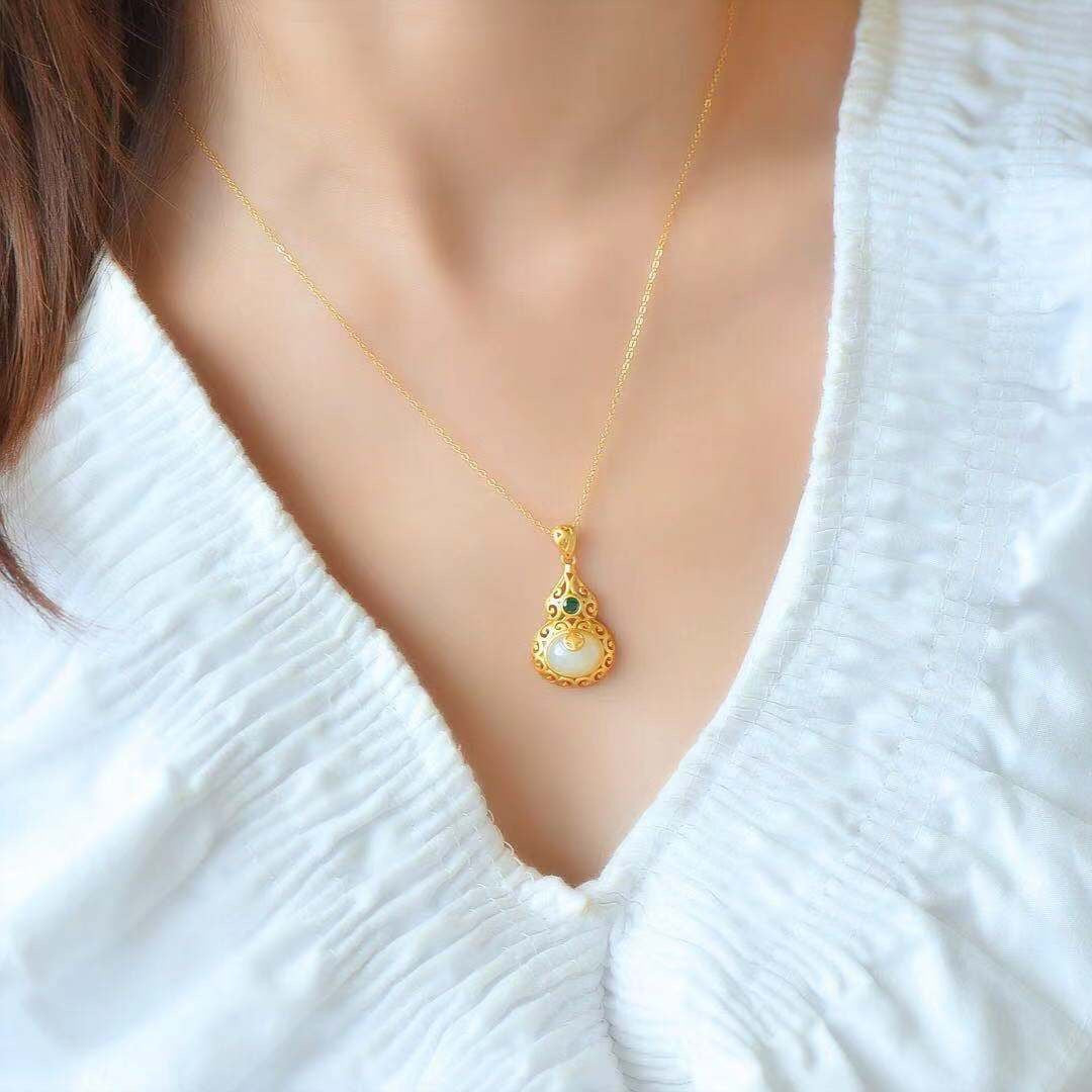 Elegant Sterling Silver Hotan Jade Pendant with Green Zircon Gourd Design Necklace