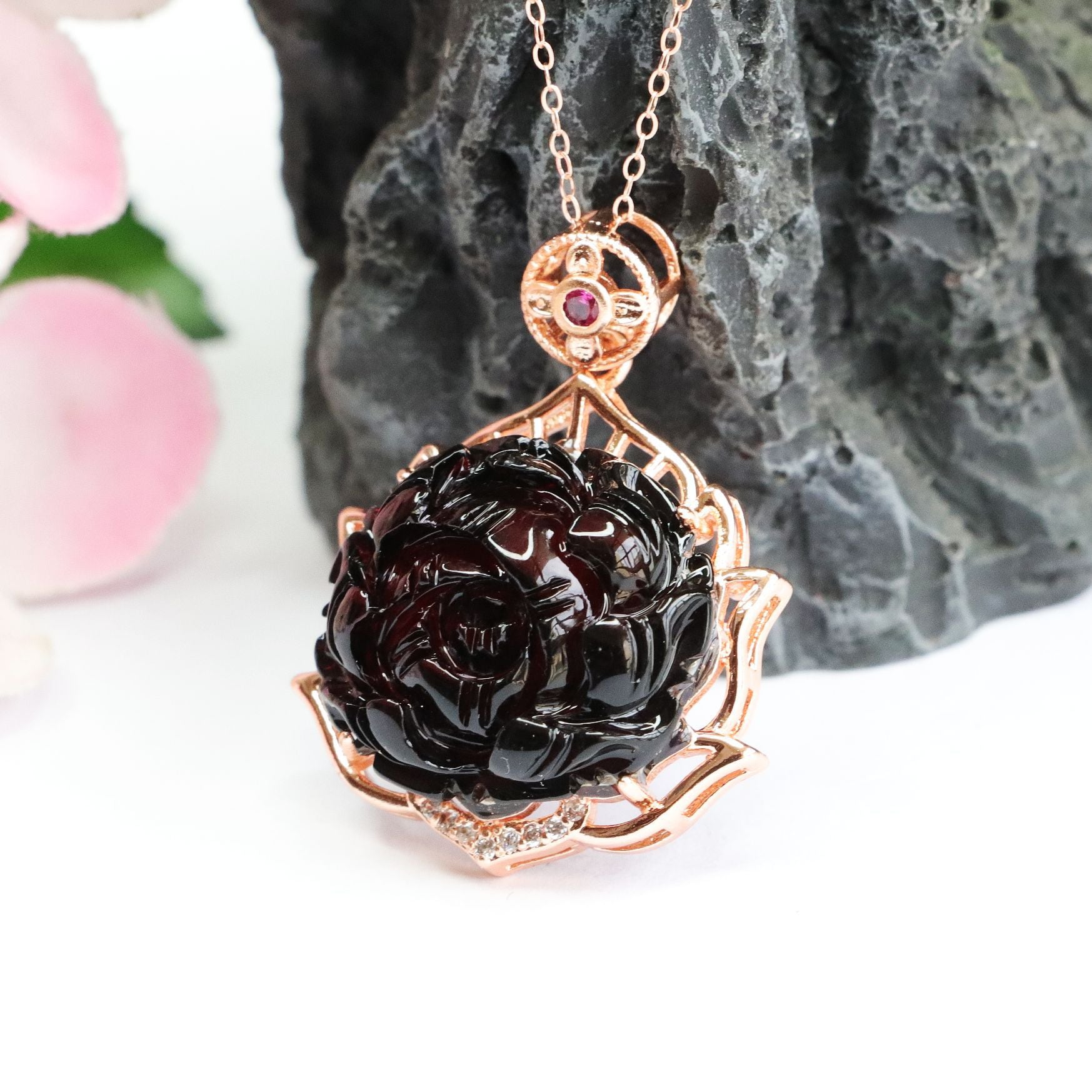 Blood Amber Fortune's Favor Peony Flower Rose Gold Necklace