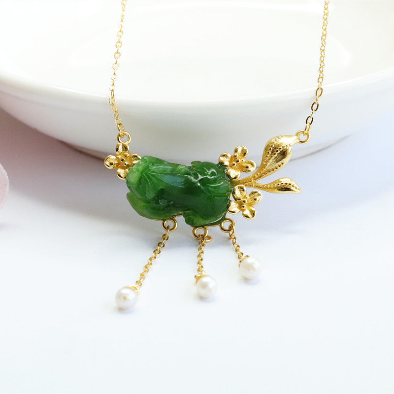 Sterling Silver Hotan Jade Jasper Pixiu Flower Necklace from Planderful Fortune's Favor Collection