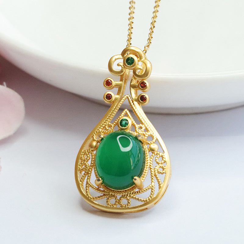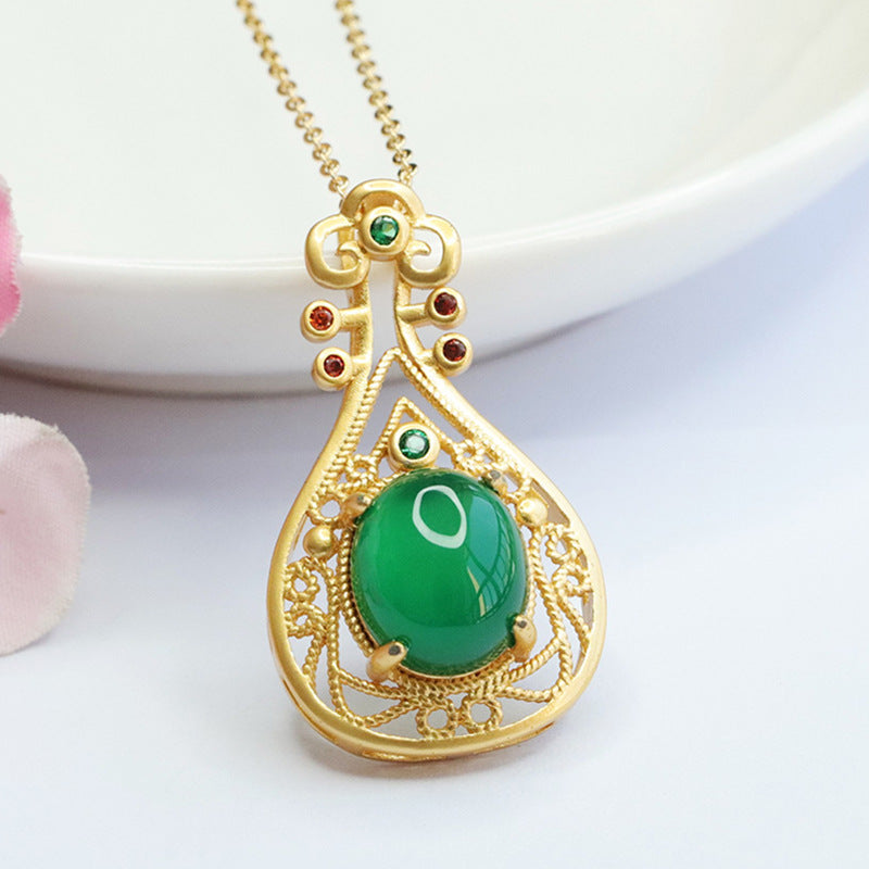 Chinese Style Sterling Silver Pipa Pendant Necklace with Emperor Green Chalcedony