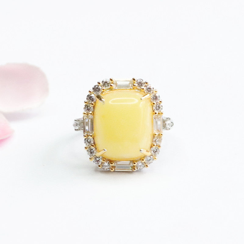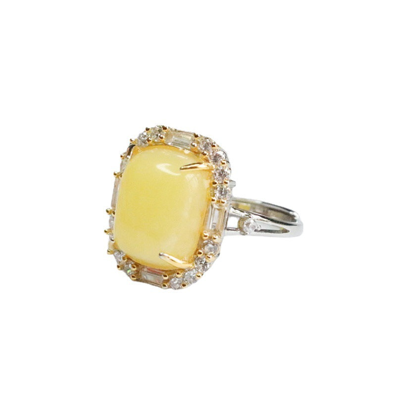 Sterling Silver Adjustable Ring with Beeswax Amber and Zircon Detail
