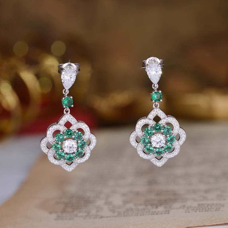 This unique drop earrings feature a flower pendant with lab-created emerald. Crafted from sterling silver, they are an exquisite addition to any wardrobe. The intricate design is perfect for special occasions, or to add a touch of glamour to an everyday look.
