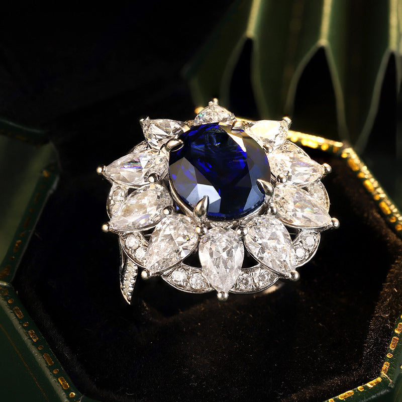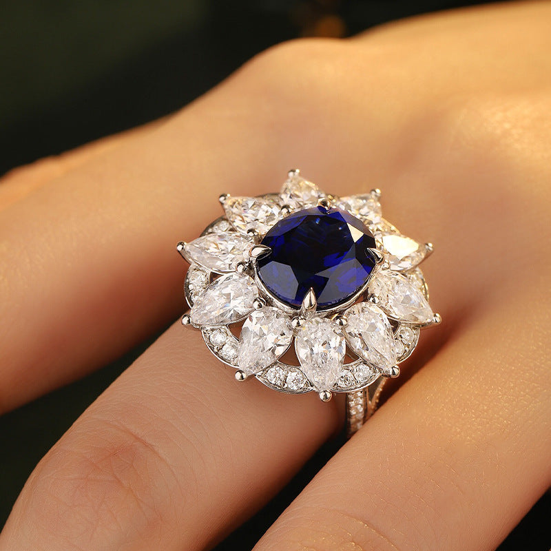 This luxurious silver ring for women is a stunning blend of Oval Lab-Created Sapphires and Water Drop zircons in an exquisite petal shape halo. The expert craftsmanship and elegant design of this ring will make you feel glamorous.