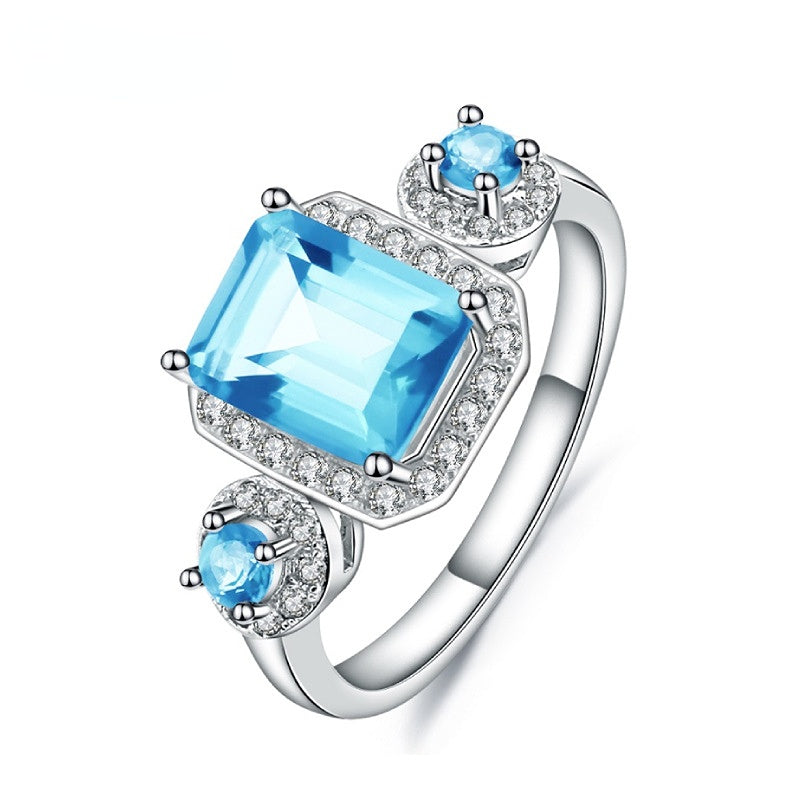 This Natural Topaz Soleste Halo Vintage Silver Ring for Women features a classic halo design. The center stone is a rectangle blue topaz, surrounded by a gleaming soleste halo, and accented with two small round topaz stones on the ring arm. This beautiful ring will make a statement and sparkle in any occasion.