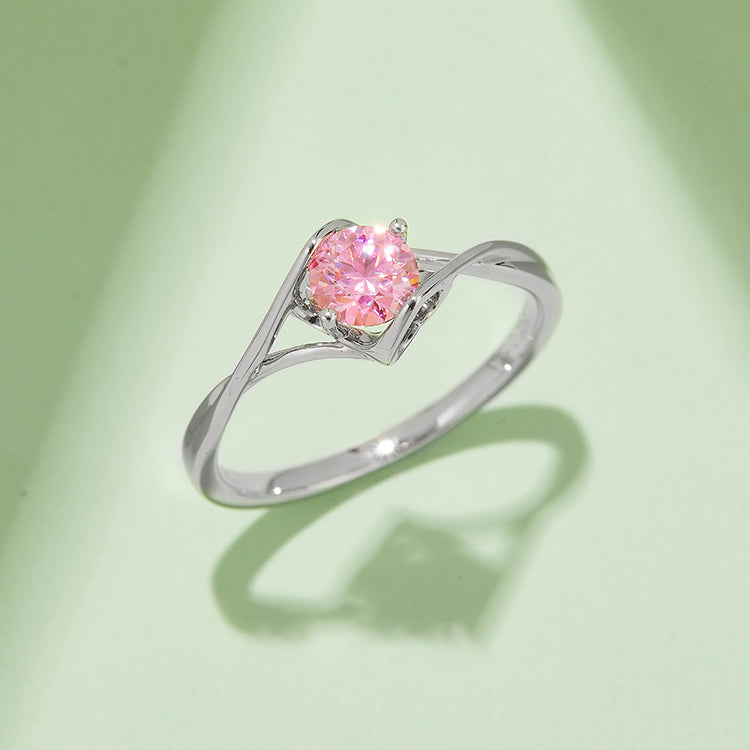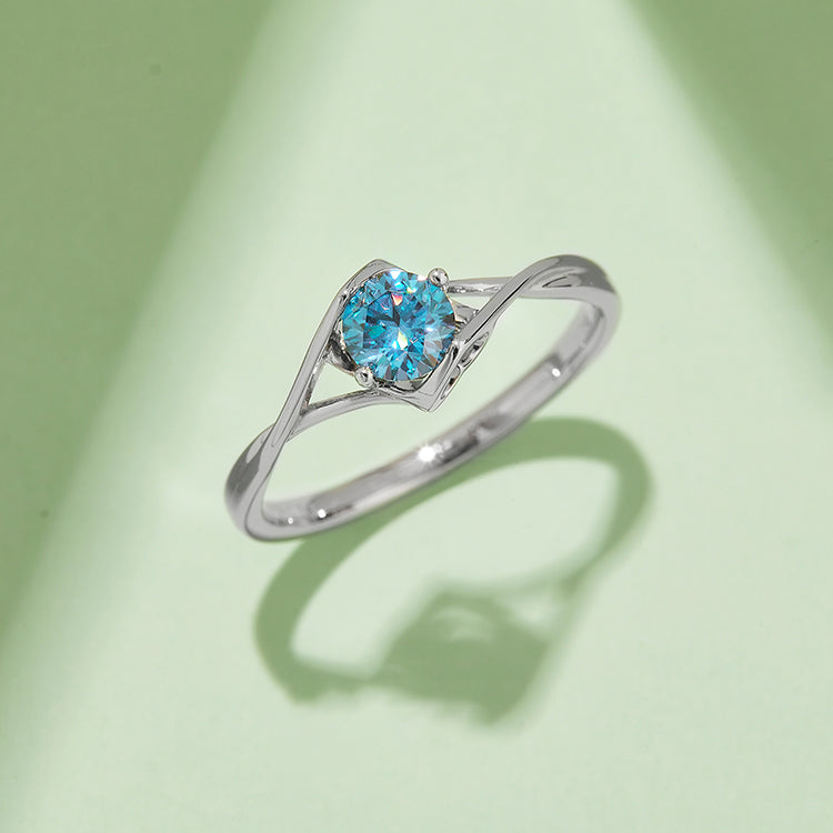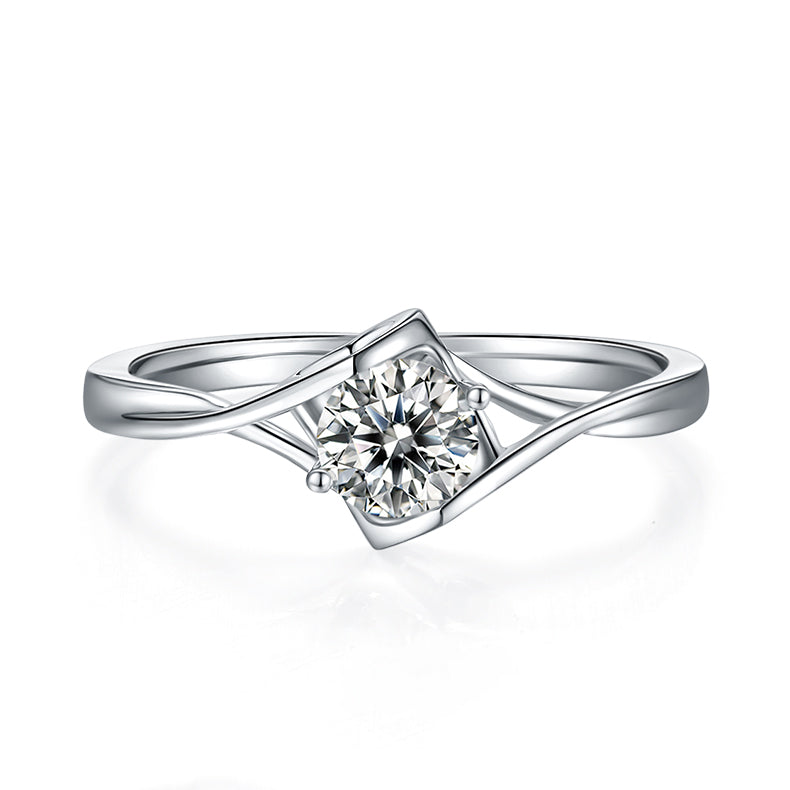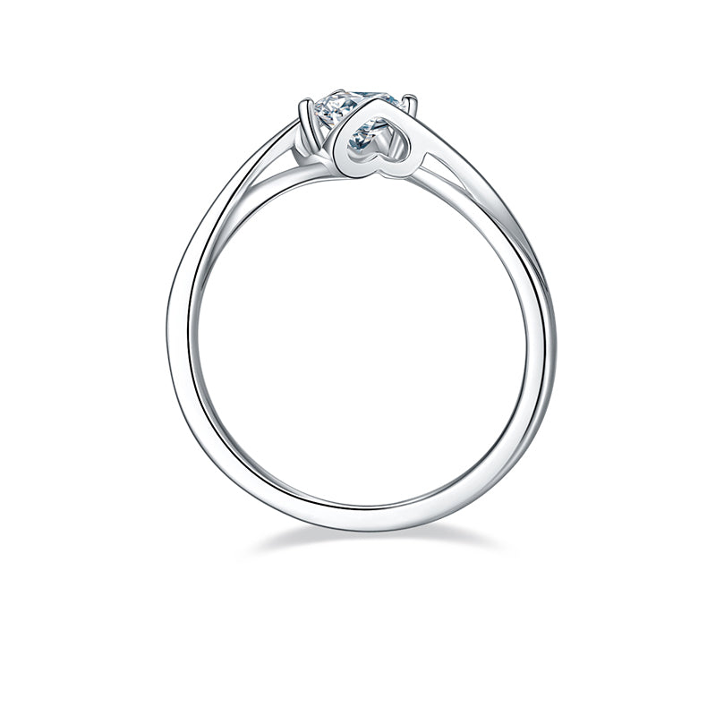 This beautiful round-cut (0.5ct) Moissanite twist ring features a unique heart-shaped prong and modern split shank embrace shape ring arms for a stunning look. Ideal for the modern woman, this ring is designed to stand out and make a statement.