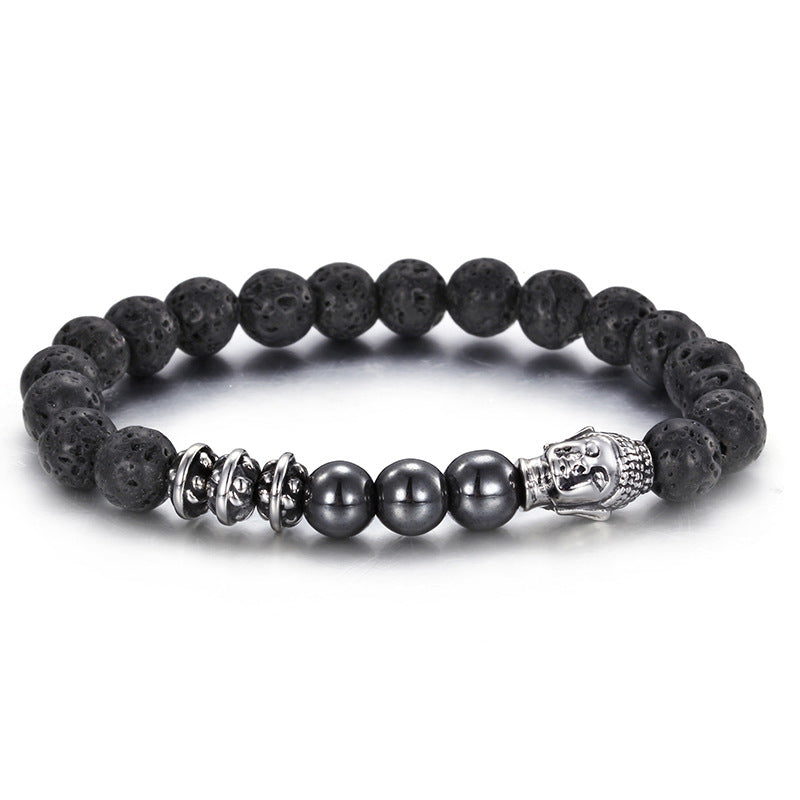 Stylish Stainless Steel Buddha Head Bracelet with Lava Volcanic Stone and Agate Beads for Men