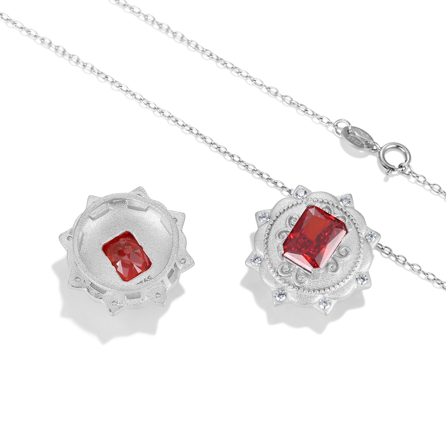 Palace Style Carved Round Pendant Rectangle Red Zircon Silver Necklace