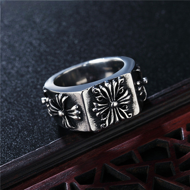 This stylish titanium steel ring for men features a vintage-style square surface decorate with a relief cross flower design. Durable and strong, this ring is perfect for everyday wear.