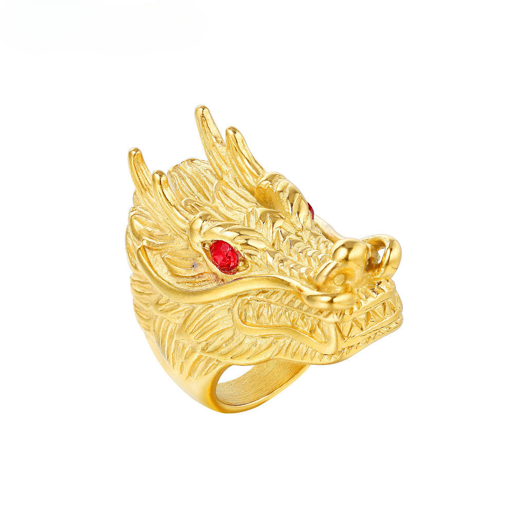 Red Eye Zircon Gold Dragon Head Titanium Steel Ring for Men
