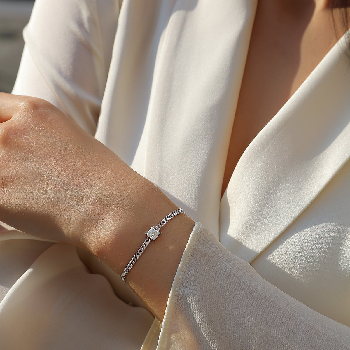 Made from high-quality Sterling Silver and plated with 18K platinum, this bracelet not only boasts a radiant shine but also promises longevity. The centerpiece is a dazzling 1.0 carat Princess Cut moissanite, known for its exceptional brilliance and fire. With a clarity rating of D/VVS/3EX, this gemstone is a perfect alternative to diamonds, providing an exquisite sparkle without the hefty price tag.