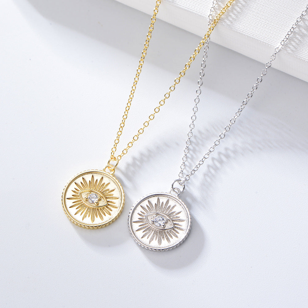 This beautiful pendant necklace features a classic circle design and a unique Devil's Eye zircon pattern. Crafted with sterling silver for longevity, it's a luxurious addition to any jewelry collection. Show off your style with this one-of-a-kind necklace.