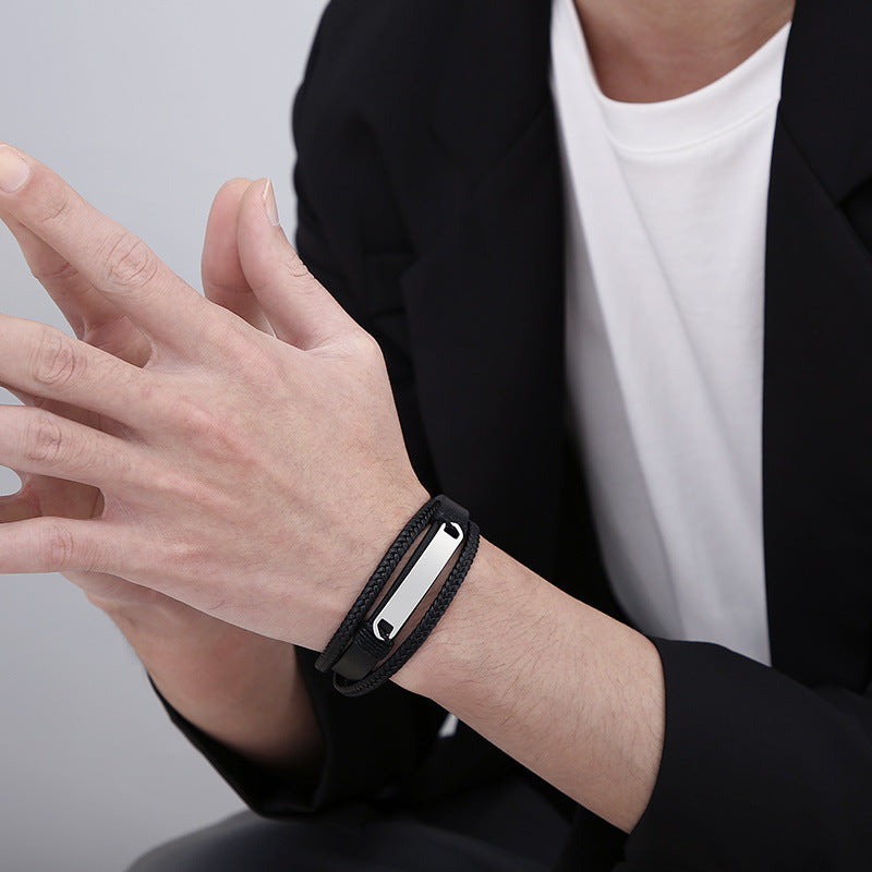 Discover the Planderful simple multi-layer leather woven bracelet—a fashionable, masculine piece designed for everyday wear. Part of the Everyday Genie collection, this men's bracelet blends a refined multi-layer leather weave with a curved titanium steel accent for a contemporary, on-trend look.