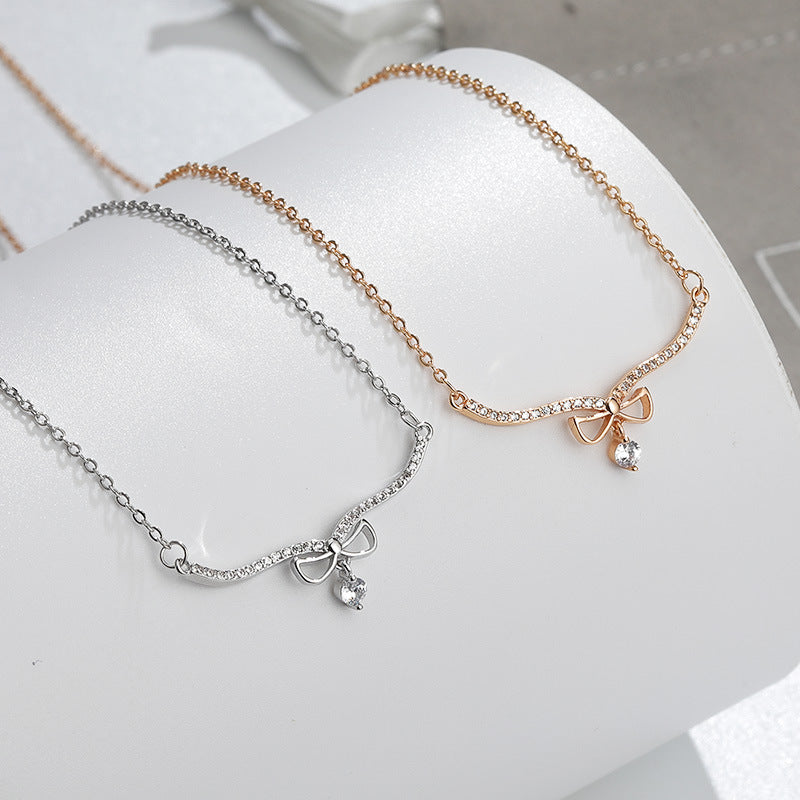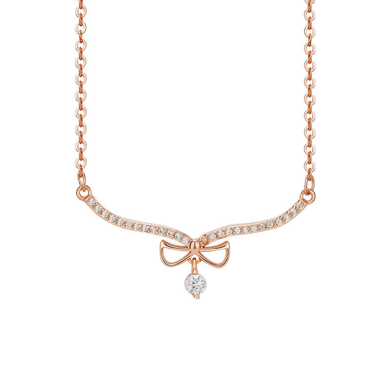 Large V-shape Bow with Zircon Pendant Silver Necklace for Women