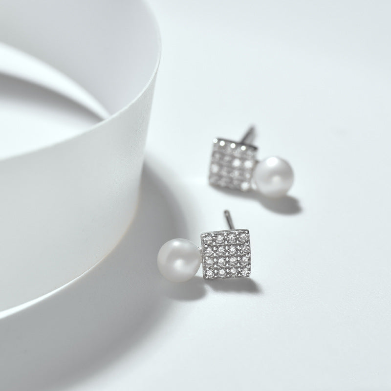 Full Zircon Square with Freshwater Pearl Silver Stud Earrings for Women