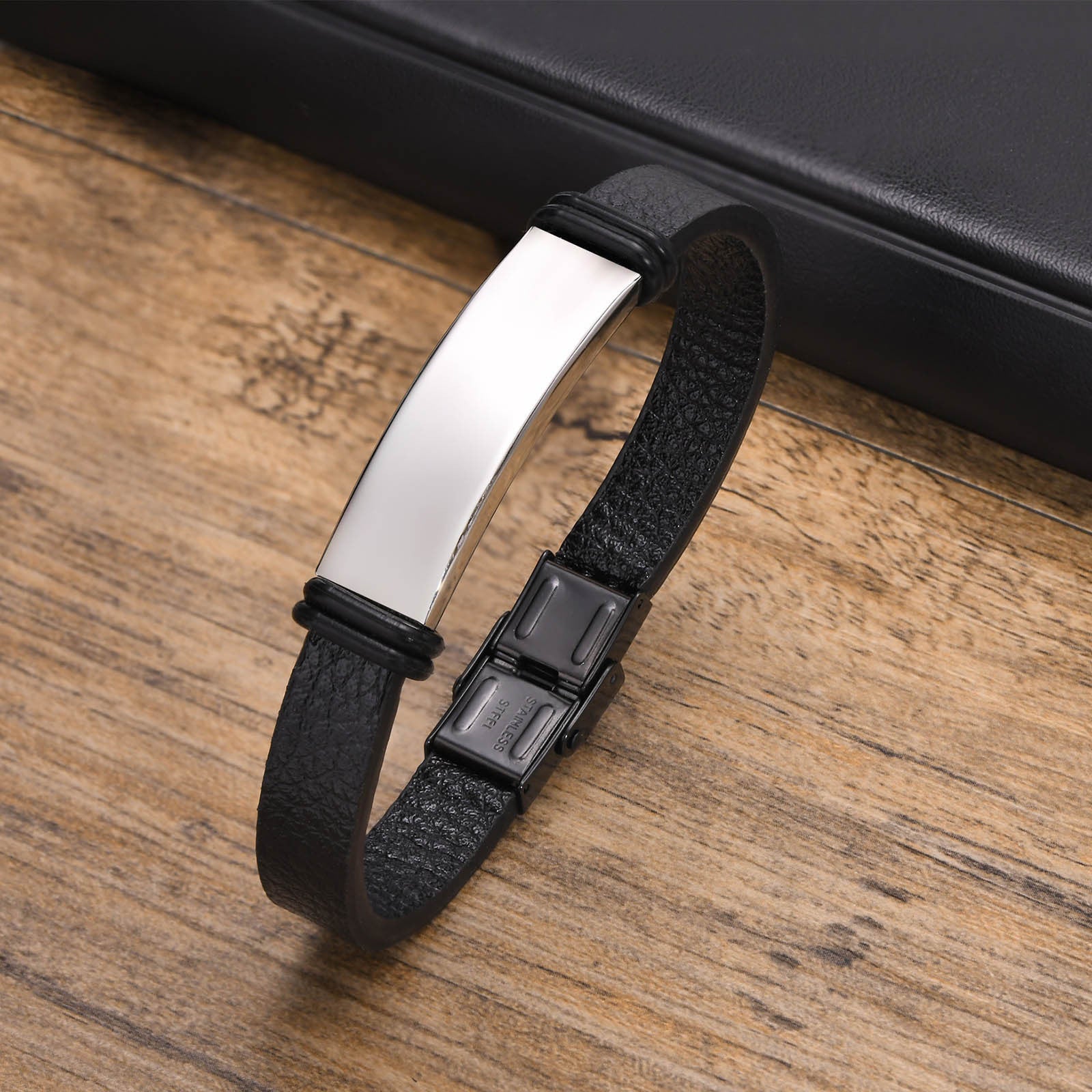 Introducing our Stainless steel black curved brand leather bracelet black men's trendy accessories jewelry wholesale, personalized for men, a premium piece that effortlessly combines style and durability. Designed for the modern man, this bracelet is perfect for those who appreciate understated elegance and robust craftsmanship.