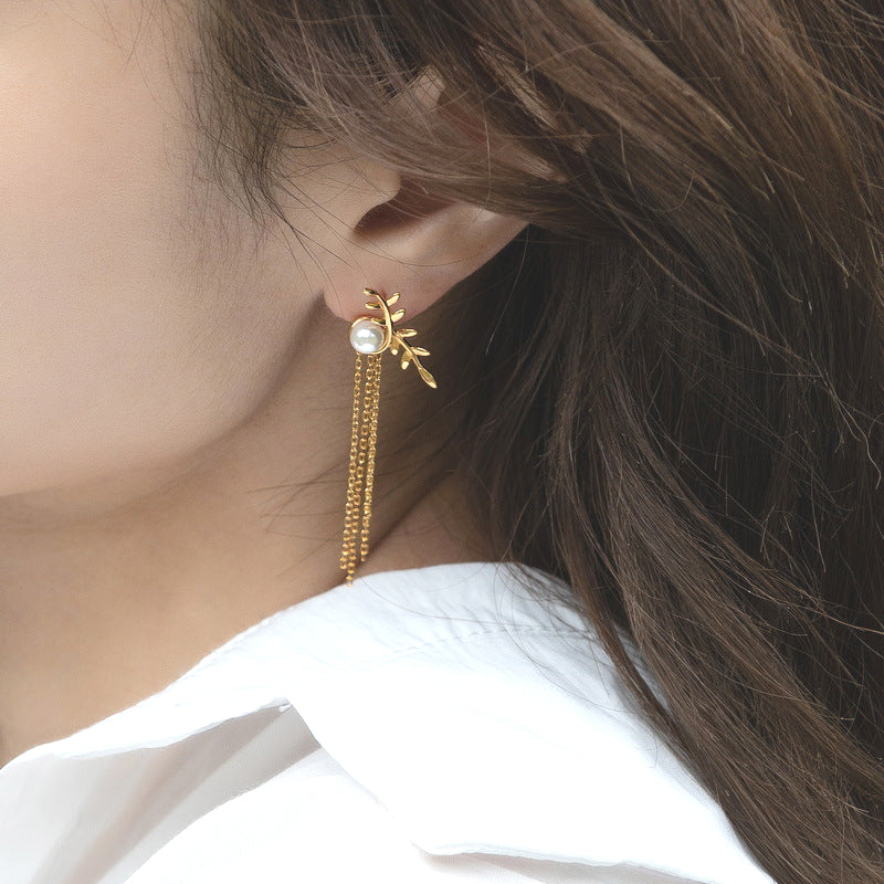 Willow Branch Leaf Round Pearl Long Tassel Sterling Silver Drop Earrings
