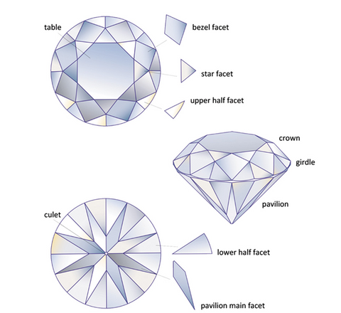 The ideal cut diamond has 57 facets, 58 if we count the butt of the diamond, and is mainly separated into 3 parts. The crown or the top, the girdle, and the pavilion or the bottom part of the diamond. The crown is composed of 33 facets, mainly the table (1), upper girdle facets (16), star facets (8), and kite facets (8). The pavilion has 25 facets, composed of the main facets (8), lower waist facets (16), and the butt (1).