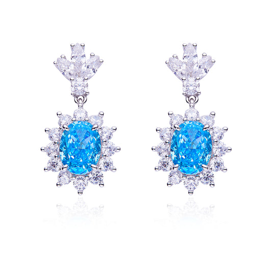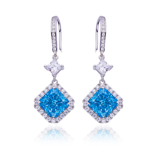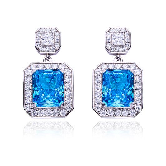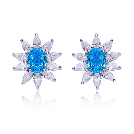 Blue Zircon 9*11mm Rectangle Ice Cut Half Annular Petals Silver Studs Earrings for Women