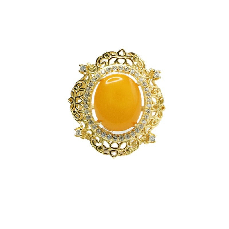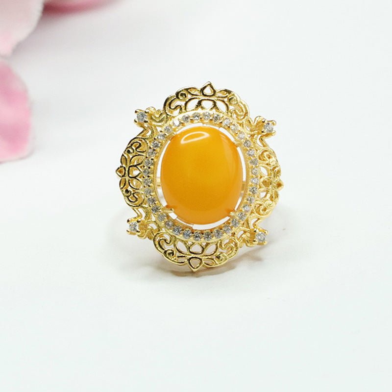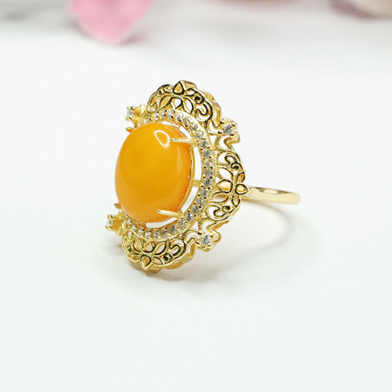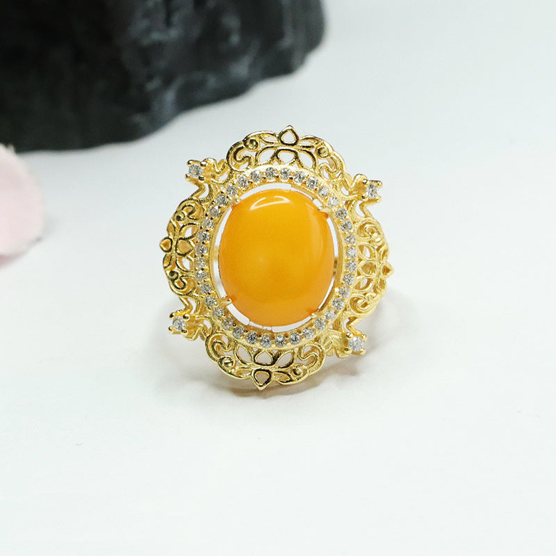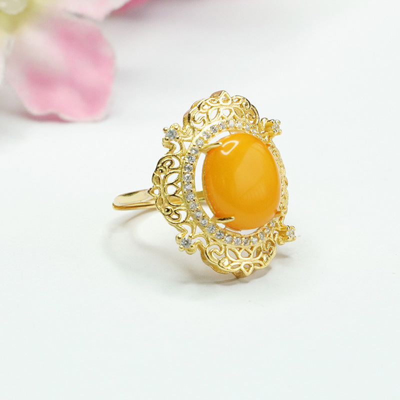 Sterling Silver Beeswax Amber Ring with Adjustable Hollow Palace Style - Retro Fortune's Favor Collection