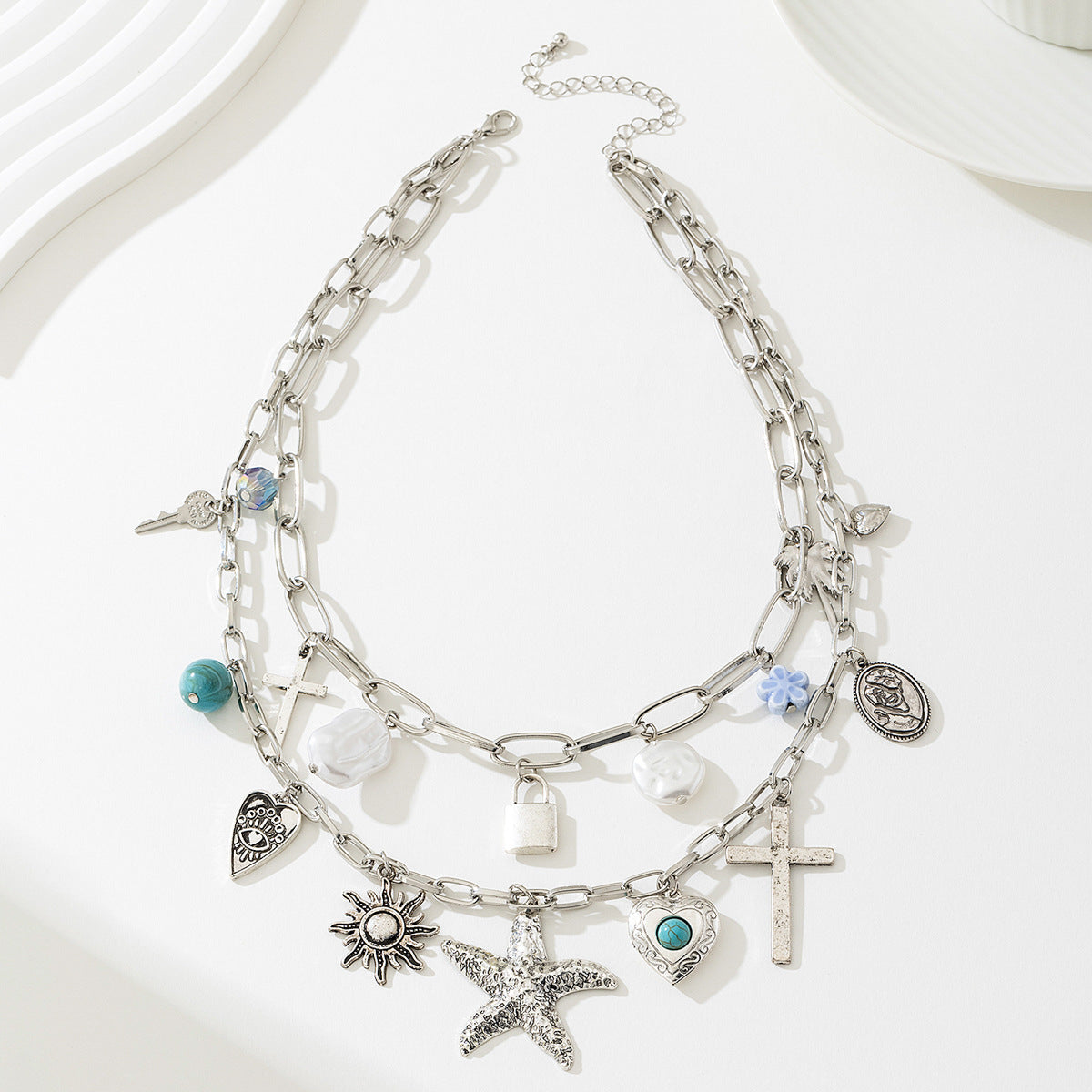 Personalized Fashion Fun Ocean Multi-Element Metal Starfish Love Cross Turquoise Female Stacked Necklace by Planderful delivers a stunning and unique accessory for everyday wear or special occasions.