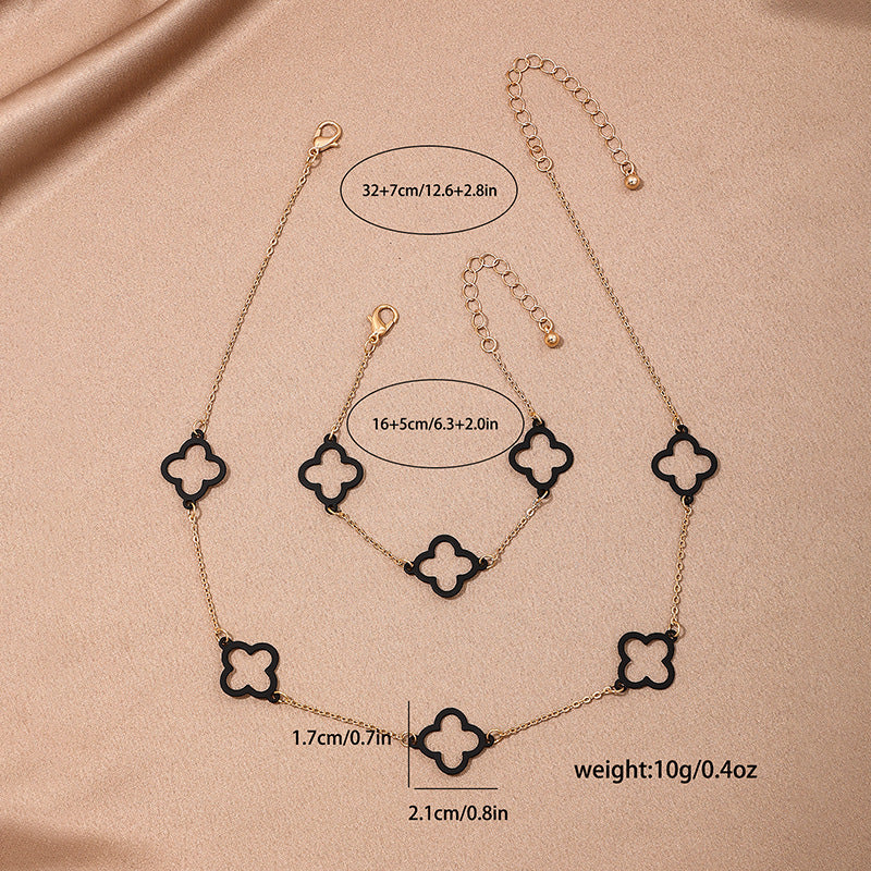 Stylish Modern Black Hollow Clover Metal Jewelry Set with Necklace and Bracelet