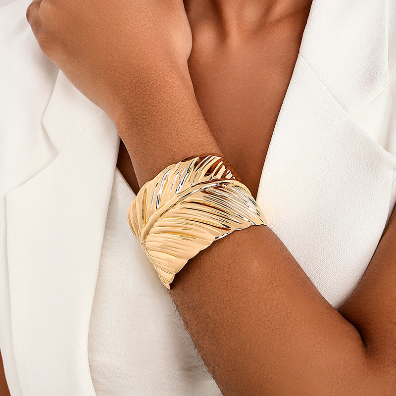 European Chic Leaf Design Metal Bangle - Statement Hand Jewelry for Women
