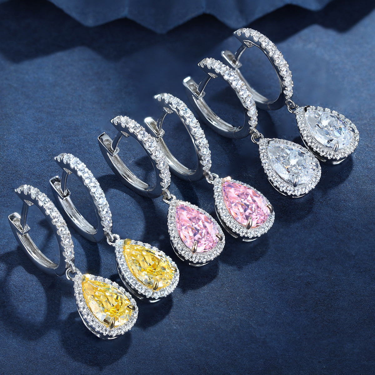 Each earring features a brilliant pear-shape Lab Grown Paraiba Stone, complemented by high carbon zircon. The soleste halo adds a dazzling touch, making these earrings a perfect choice for special occasions or everyday wear.