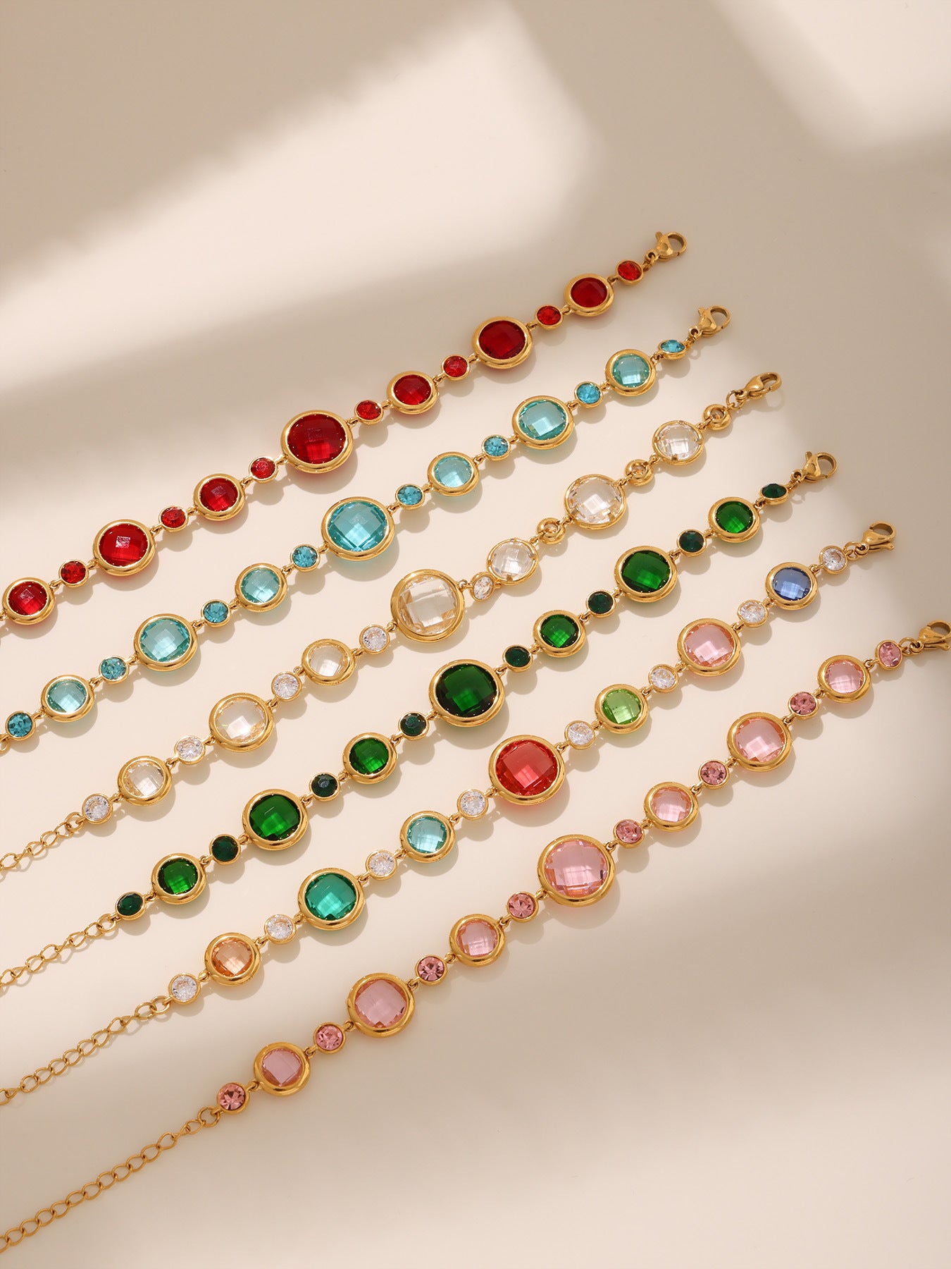 Designed to catch the light with a spectrum of hues, this colorful bracelet is perfect for adding a pop of color to any look. Its delicate gem chain exudes subtle sophistication, making it a versatile accessory for both everyday wear and special occasions. A thoughtful gift idea for birthdays, anniversaries, or simply to treat someone special to a touch of refined sparkle.