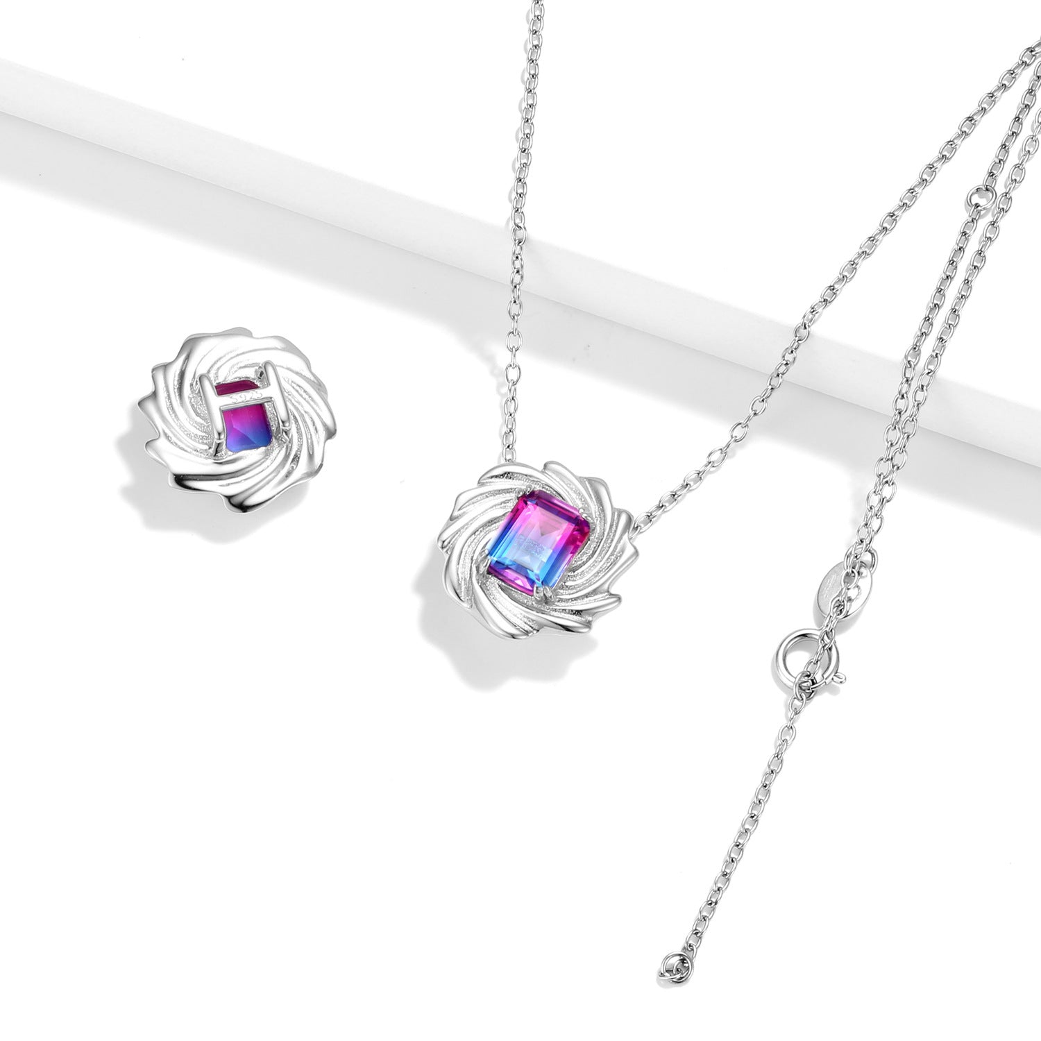 Enhance your look with this eye-catching Vortex Shape Pendant Necklace, featuring a blue mix purple Emerald Cut Zircon in center. Crafted with sterling silver. perfect for adding a touch of sparkle to any outfit.