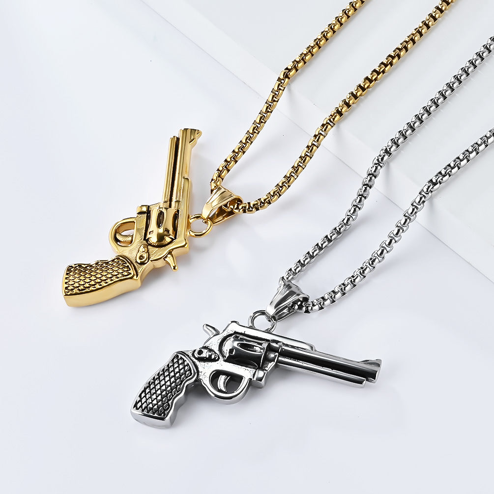 Elevate your style with the Cross-border hip-hop hiphop titanium steel revolver pendant, a striking accessory designed for the modern man who embraces individuality. Crafted from high-quality titanium steel, this pendant is not just a piece of jewelry; it’s a statement that reflects your unique personality and passion for hip-hop culture.