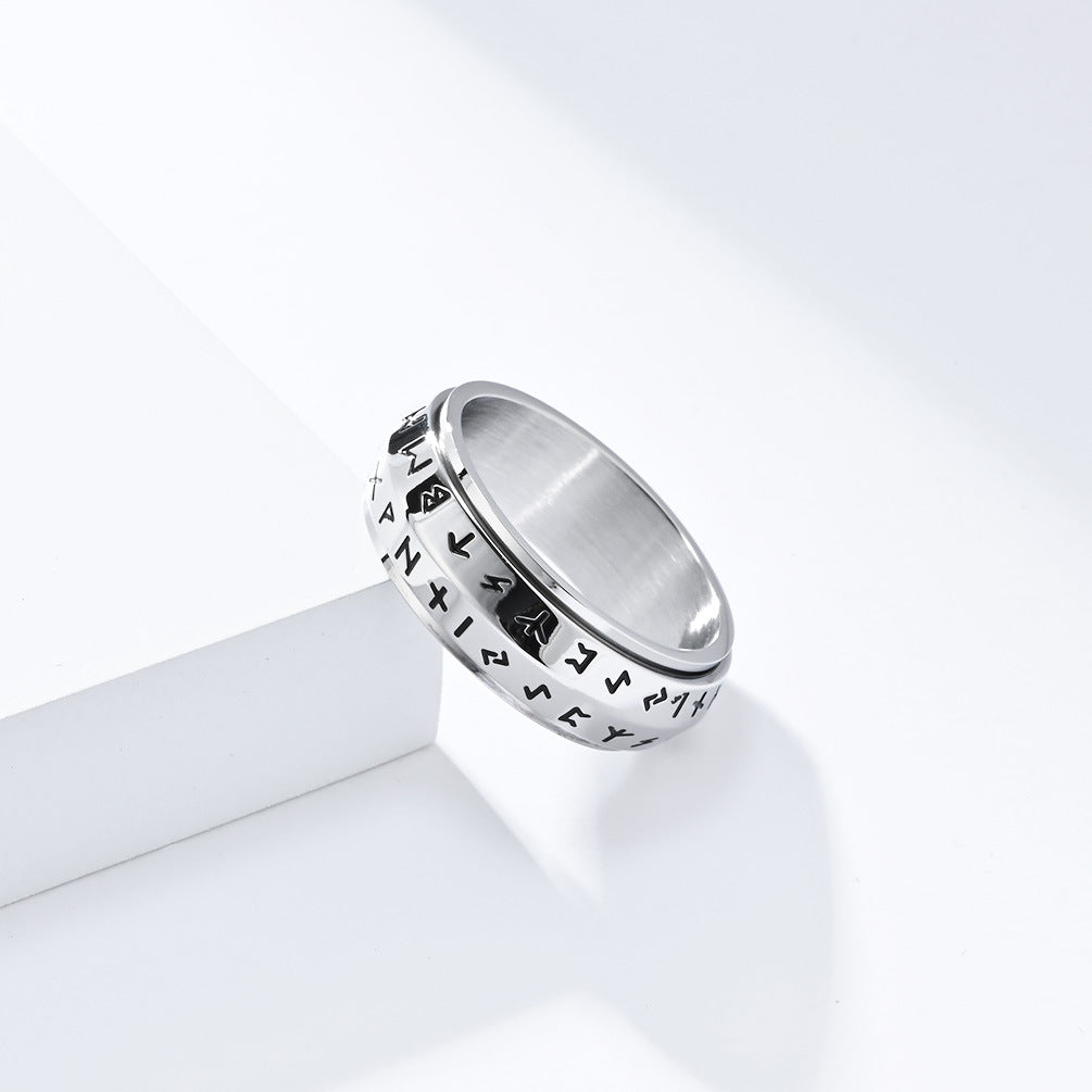 Introducing the Cross-border hot-selling Nordic Viking text rotatable titanium steel ring ring men's stress relief anxiety jewelry for men, a unique blend of style and functionality. This stunning piece is designed not only to elevate your fashion statement but also to provide you with a calming presence during stressful moments. Crafted from high-quality titanium steel, this ring is both durable and lightweight, making it the perfect everyday accessory.